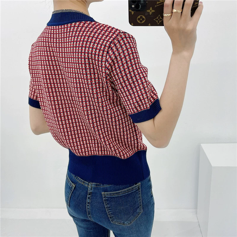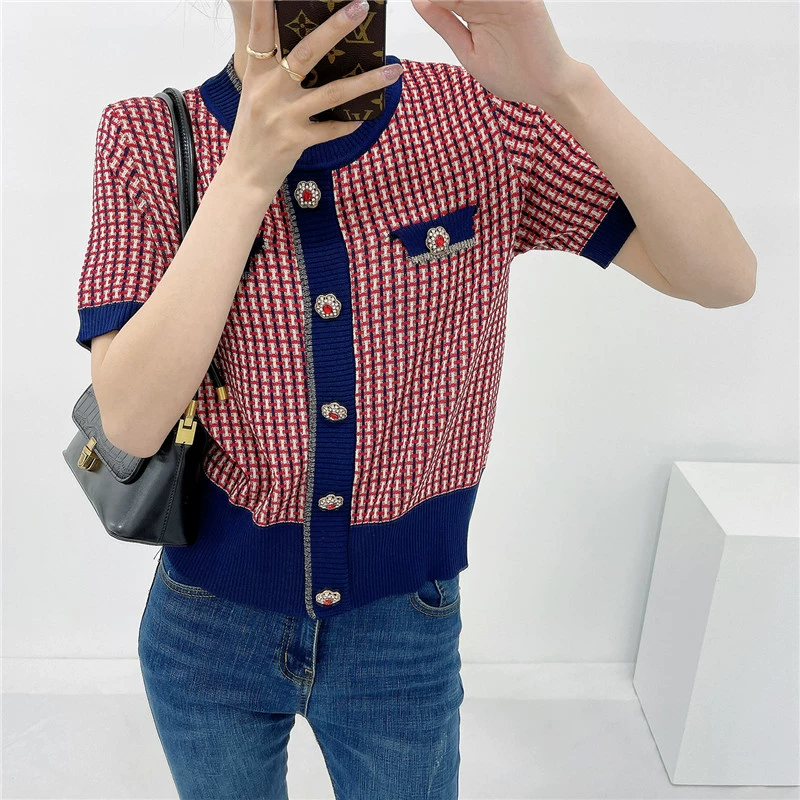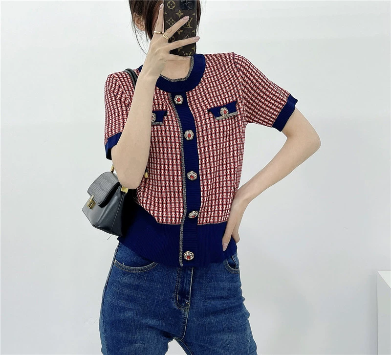 Блузка женская в клетку, с круглым вырезом и пуговицами
