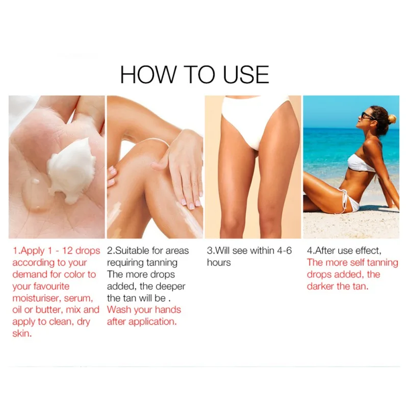 1. Добавьте 2-12 капель загара в ваш любимый лосьон для тела или увлажняющий крем, Смешайте вместе и равномерно нанесите на кожу. (Чем больше загар вы потеете, тем темнее он будет)