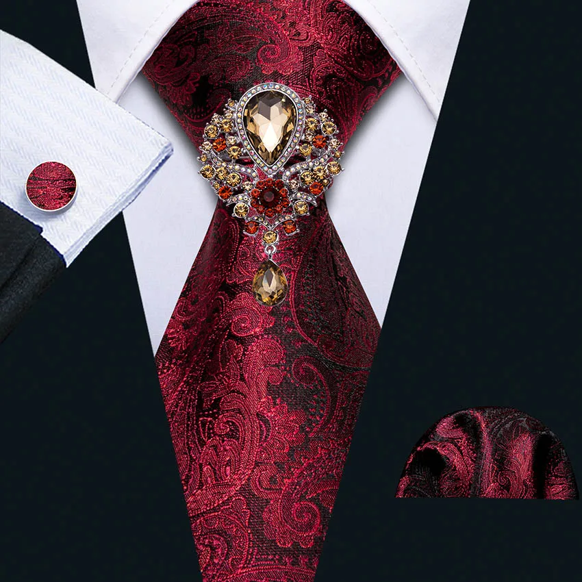 Мужской галстук, красная брошь из шелка, стразы, Свадебный комплект, платок Barry.wang, однотонные Галстуки