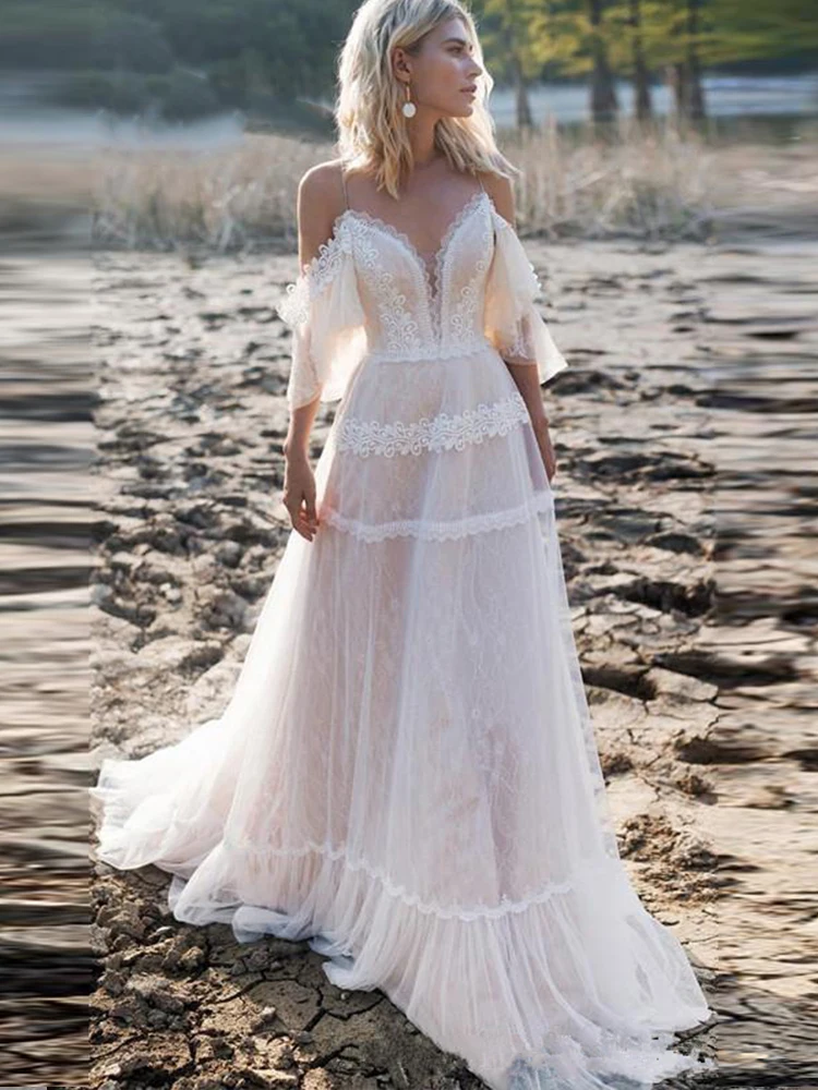 Свадебное платье в стиле бохо, кружевное пляжное платье на бретелях...