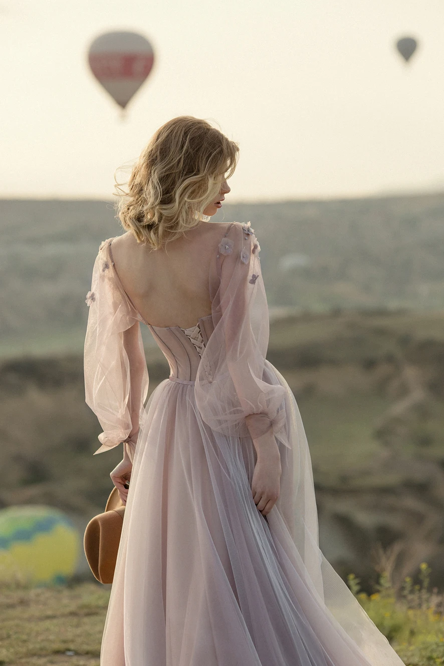 Романтическое розовое свадебное платье принцессы в стиле бохо, с открытыми плечами, пышными длинными рукавами, из тюля, с открытой спиной, с цветами