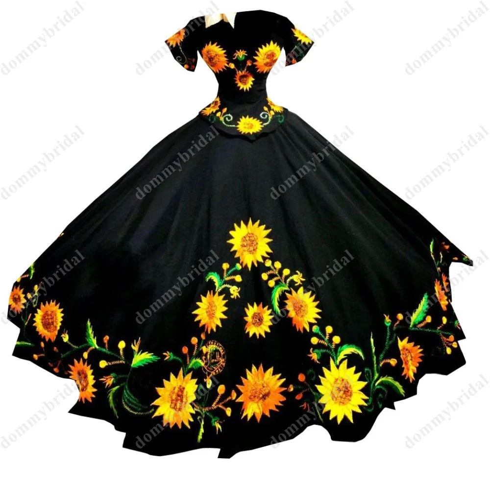 Женское платье с вышивкой в виде подсолнуха, черное пышное платье с открытыми плечами, 2022
