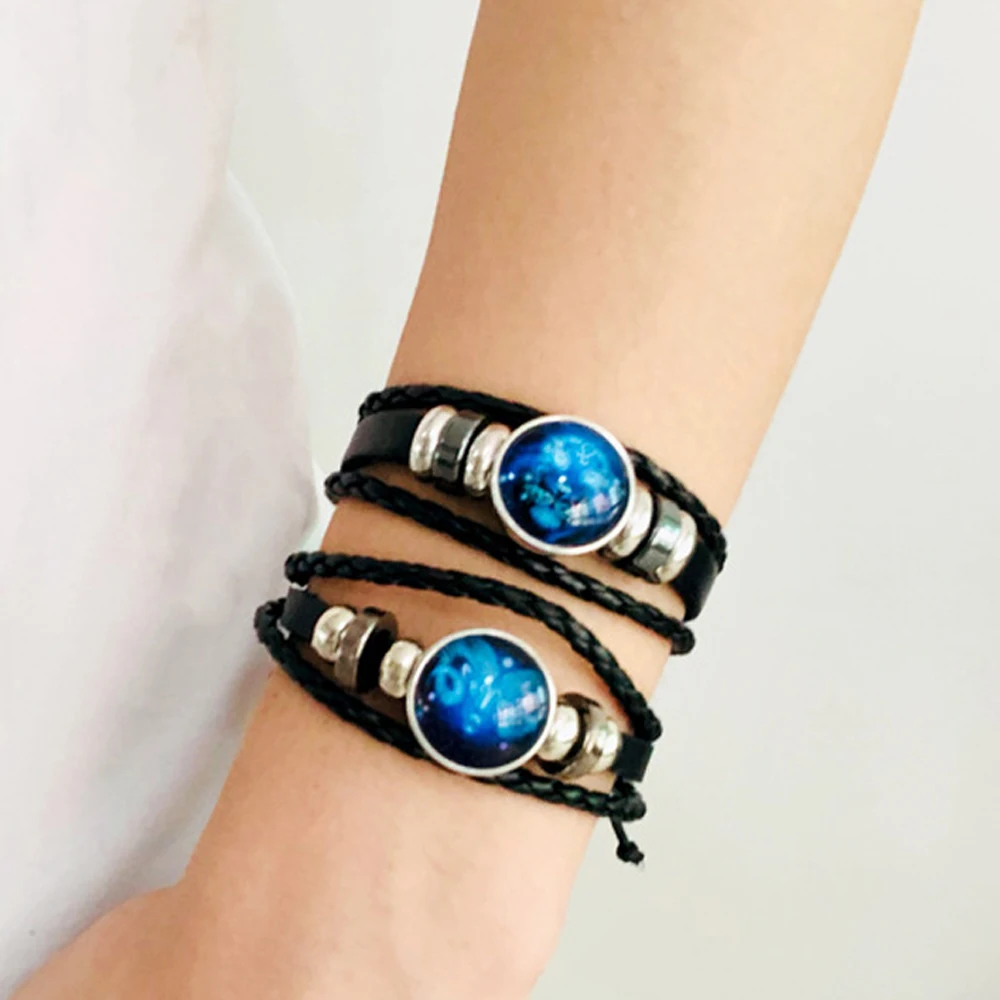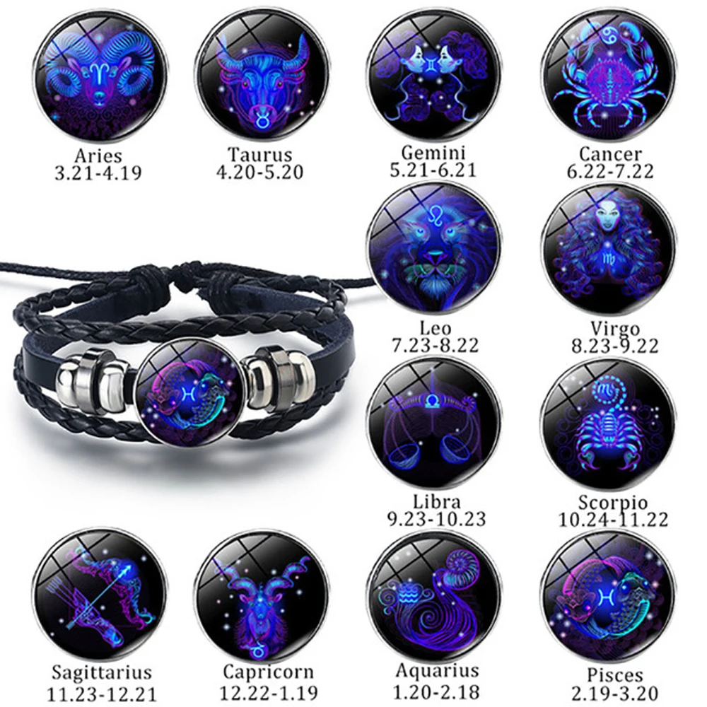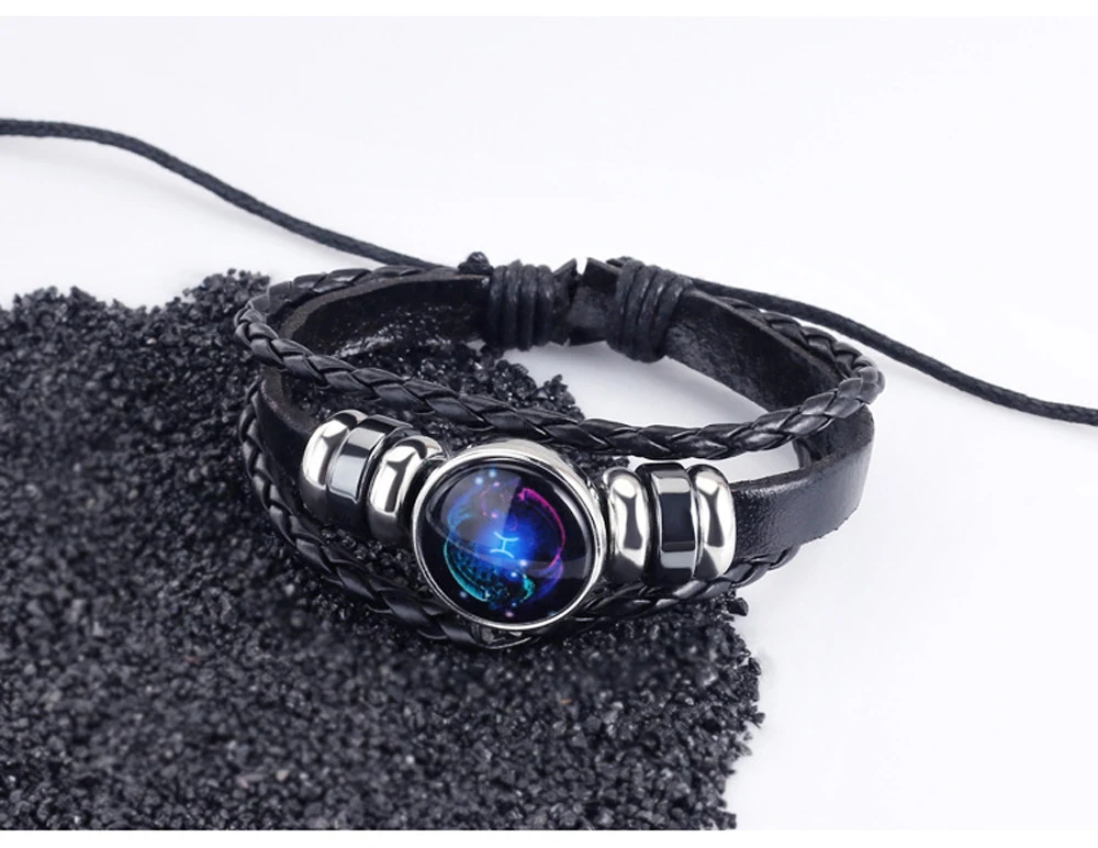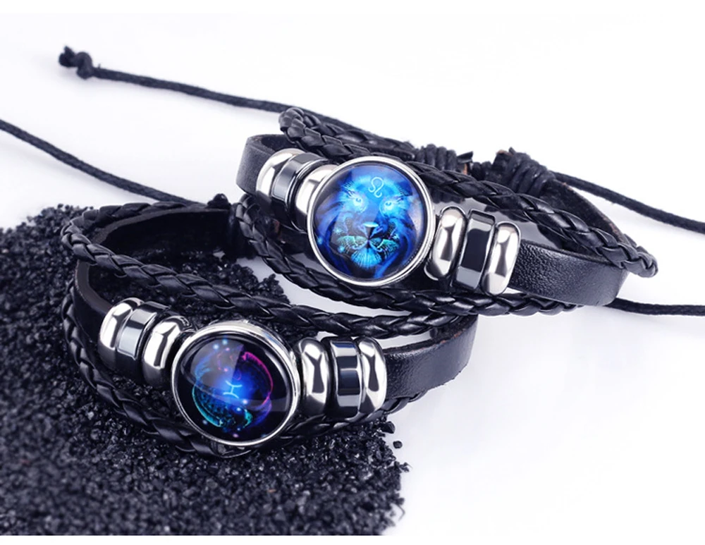 12 созвездий Зодиака Знаки зодиака Черная Плетеная кожа Близнецы Рак Лев Дева Весы СкорпионСтрелец Козерог Водолей Рыбы Плетеный стеклянный купол ювелирные изделия панк парный мужской браслет подарок оптовая продажа