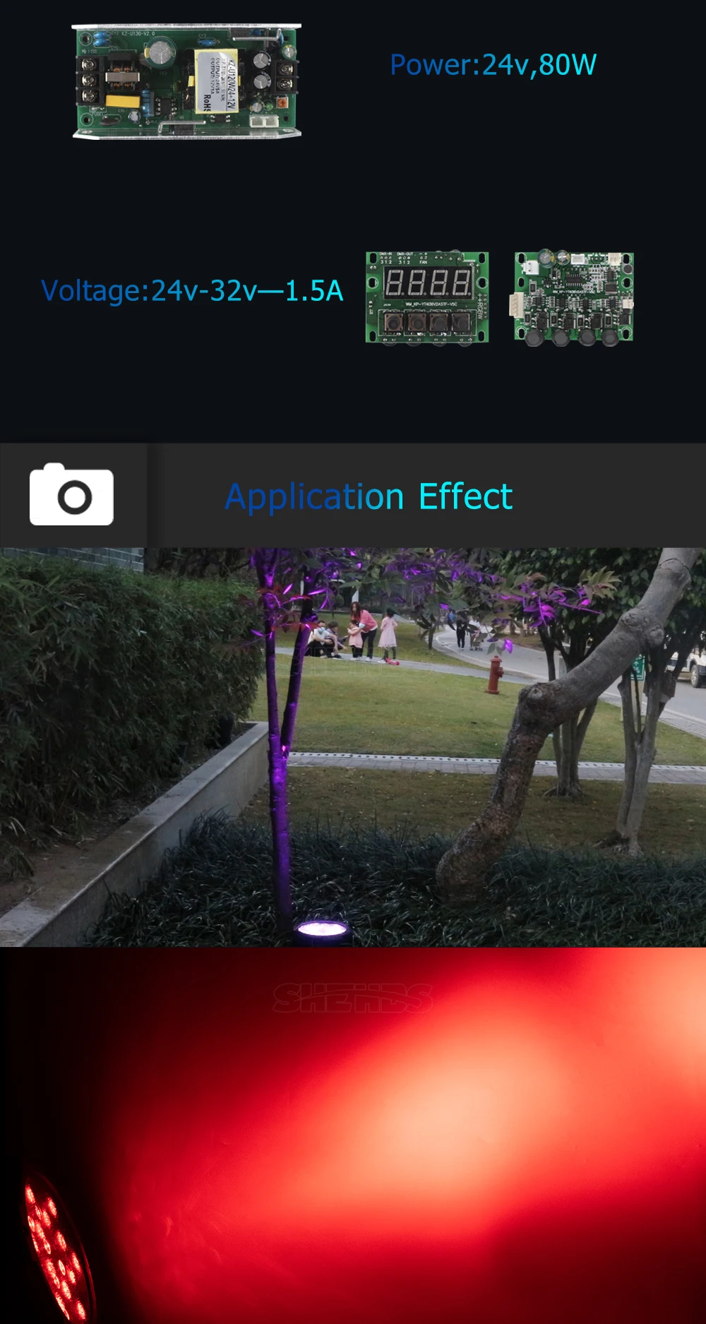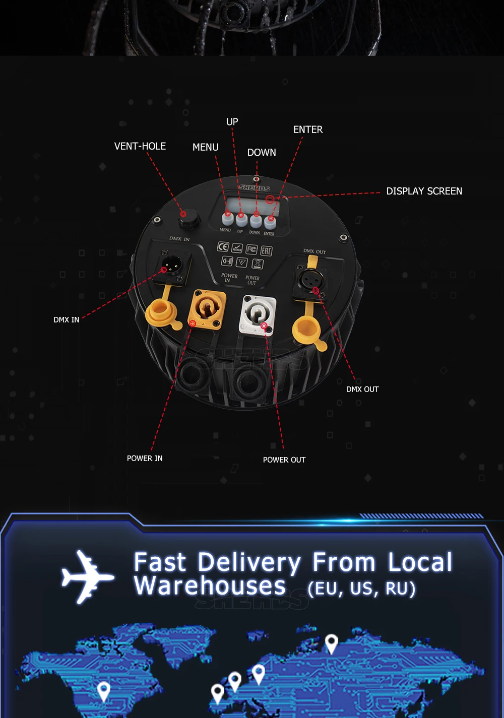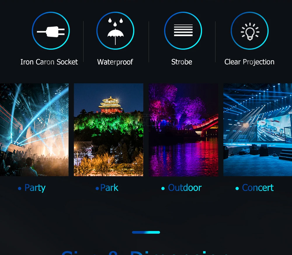 * Режимы управления: DMX512, автоматический запуск, звуковое действие, стробоскоп, автономный и мастер/раб, с богатой усовершенствованной встроенной программой