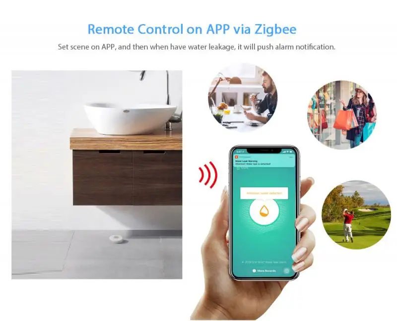 Пульт дистанционного управления в приложении с помощью Zigbee Set scene в приложении, а затем, когда есть утечка воды, он будет оповещать о тревоге.
