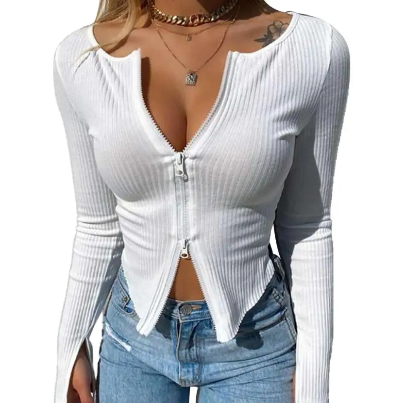 Женские рубашки, Новые однотонные вязаные топы в рубчик с длинным рукавом, пуловер на молнии, элегантные облегающие офисные футболки