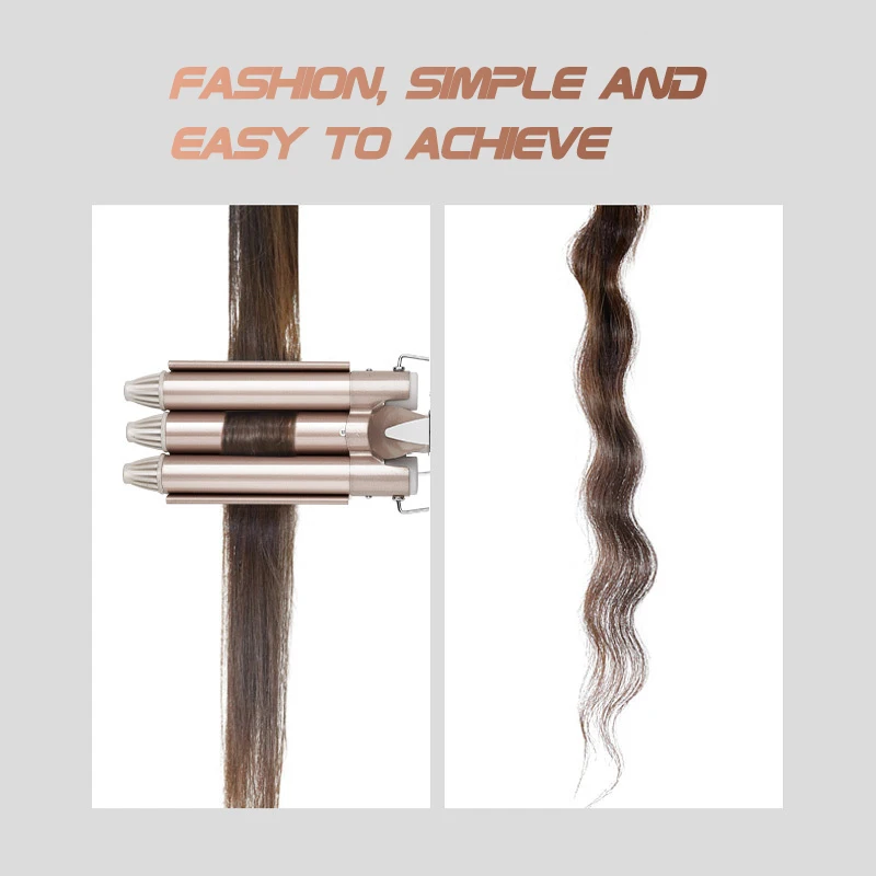 Теплопроводящий Материал: турмалиновая керамика Напряжение: 110-240 В Характеристики вилки: европейские правила, американские правила Частота: 50/60 Гц Мощность: 45 Вт Подходящие волосы: сухие Контроль температуры: регулируемый 170 °C, 220 °C Цвет: Шампань Длина кабеля: 1,7 м Размер: около 33x8,2 см (длина * ширина) ③ Особенность: 1. Керамический 3-трубчатый дизайн 2. Высококачественный нагреватель с функцией завивки, отличный инструмент для создания естественных, элегантных и долговечных локонов в течение всего дня. 3. Технология контроля температуры, однокнопочный переключатель и 2 режима (170 и 220 градусов), регулируемая температура, более безопасное использование 4. Импортная технология покрытия керамической глазурью, устойчивость к высоким температурам, керамическая технология обеспечивает равномерный нагрев при высокой температуре и защищает ваши волосы, делая их более здоровыми, естественными и блестящими. 5. Оборудование для быстрого нагрева, получите наиболее подходящие ощущения в течение 30 секунд ③Инструкции: 1. Волосы должны быть полностью сухими и тщательно расчесываться, а затем используйте расческу, чтобы разделить волосы на пряди ков перед использованием. 2. После включения питания нажмите переключатель в желаемое положение и нагрейте в течение 1 минуты. 3. Намотайте примерно на 2 дюйма в ширину между указательным и средним пальцами и прижмите плойку к волосам в течение нескольких секунд. 4. Медленно перемещайте от корня до конца, точно так же, как и при следующих волосах. 5. Возможно, вам понадобится использовать заколки для разделения густых прядей волос. 6. После использования оставьте остыть минимум на 15 минут, а затем храните. ③ Предупреждение: 1. Храните в недоступном для детей месте, поскольку они могут представлять опасность. 2. Пожалуйста, обратите особое внимание на внешние части железной пластины, они очень горячие и могут привести к горению. 3. Не касайтесь кожи шеи или лица. 4. Держите бигуди закрытыми до 10 секунд, чтобы не повредить волосы.