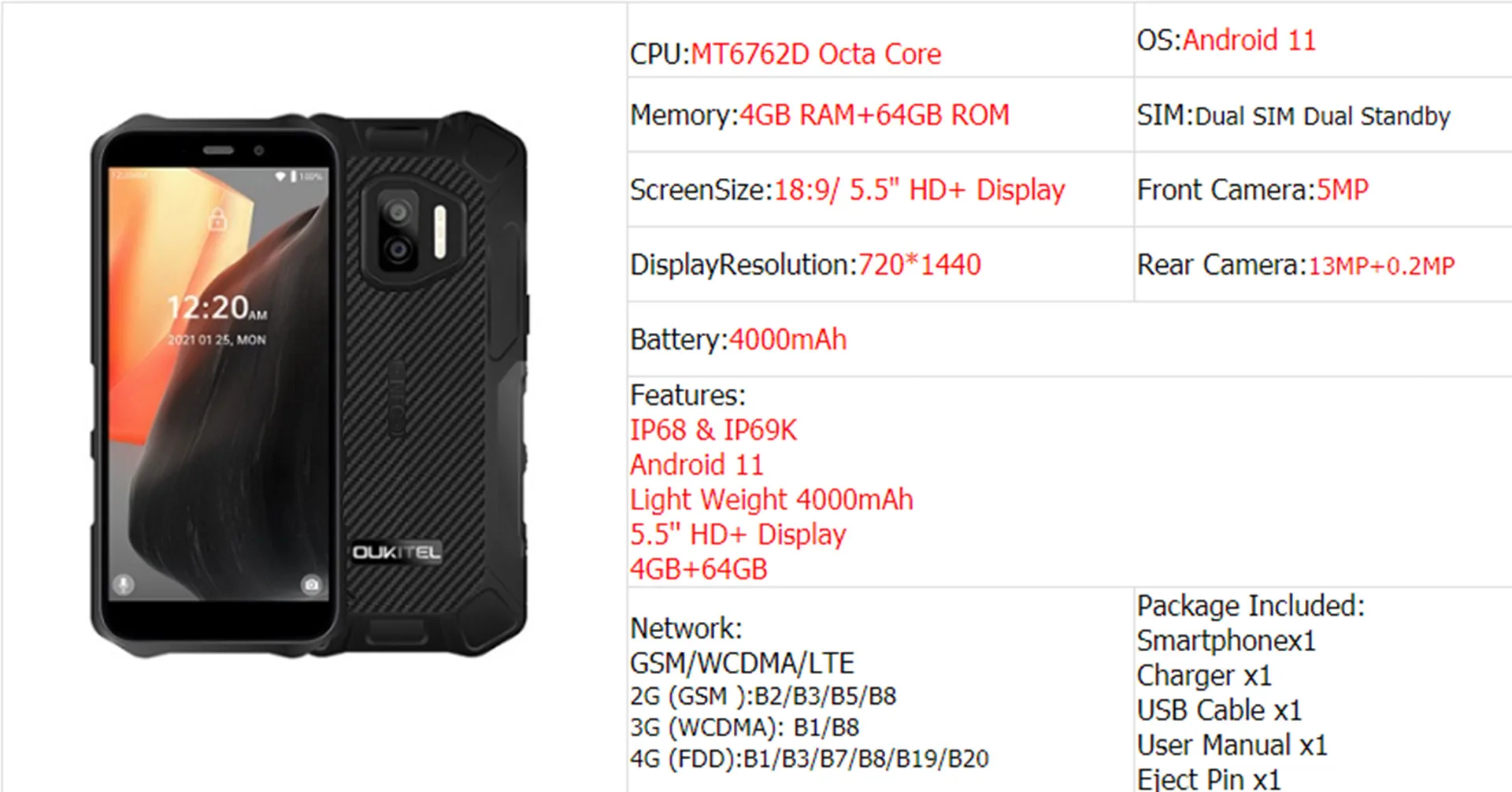OUKITEL WP12 Pro защищенный, 4 Гб + 64 ГБ, Android 11, четырёхъядер...