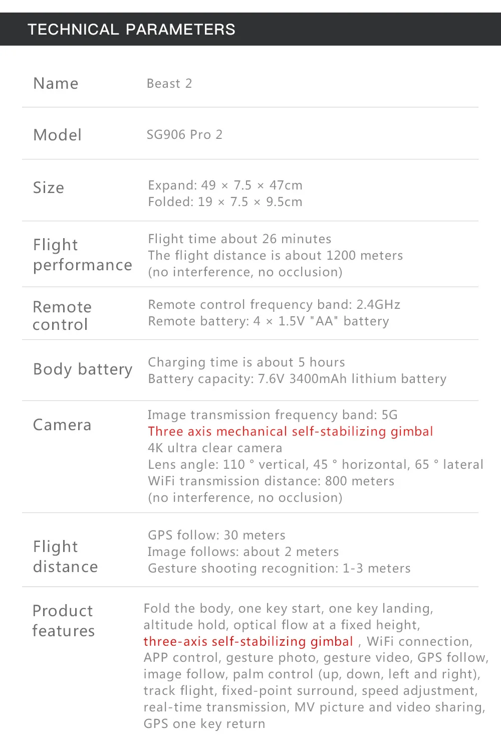 Примечание:SG906Pro Дрон, с 2 осями стабилизатор карданный камеры; SG906Pro2 Дрон, с 3 Осями стабилизатор карданный камеры