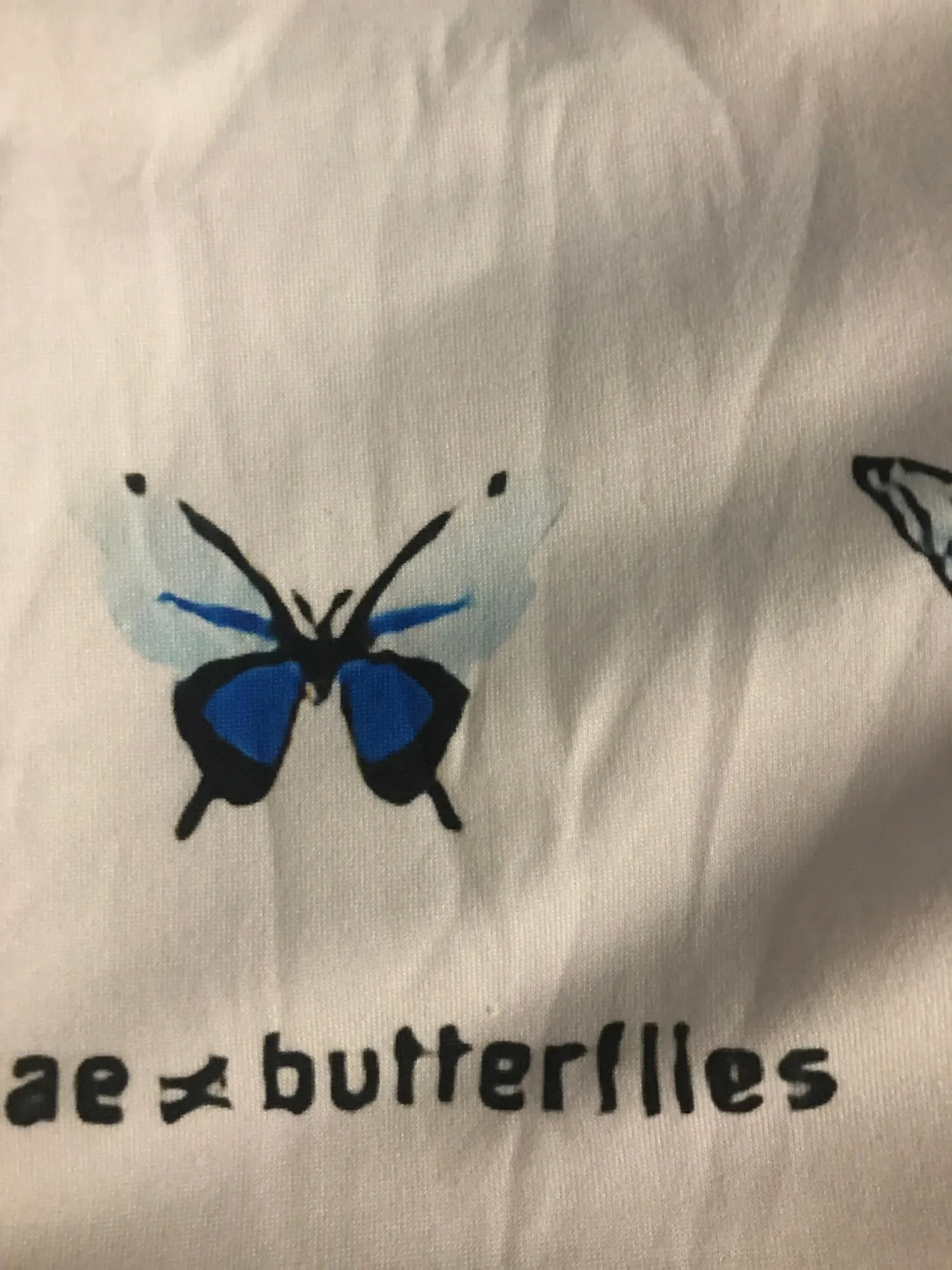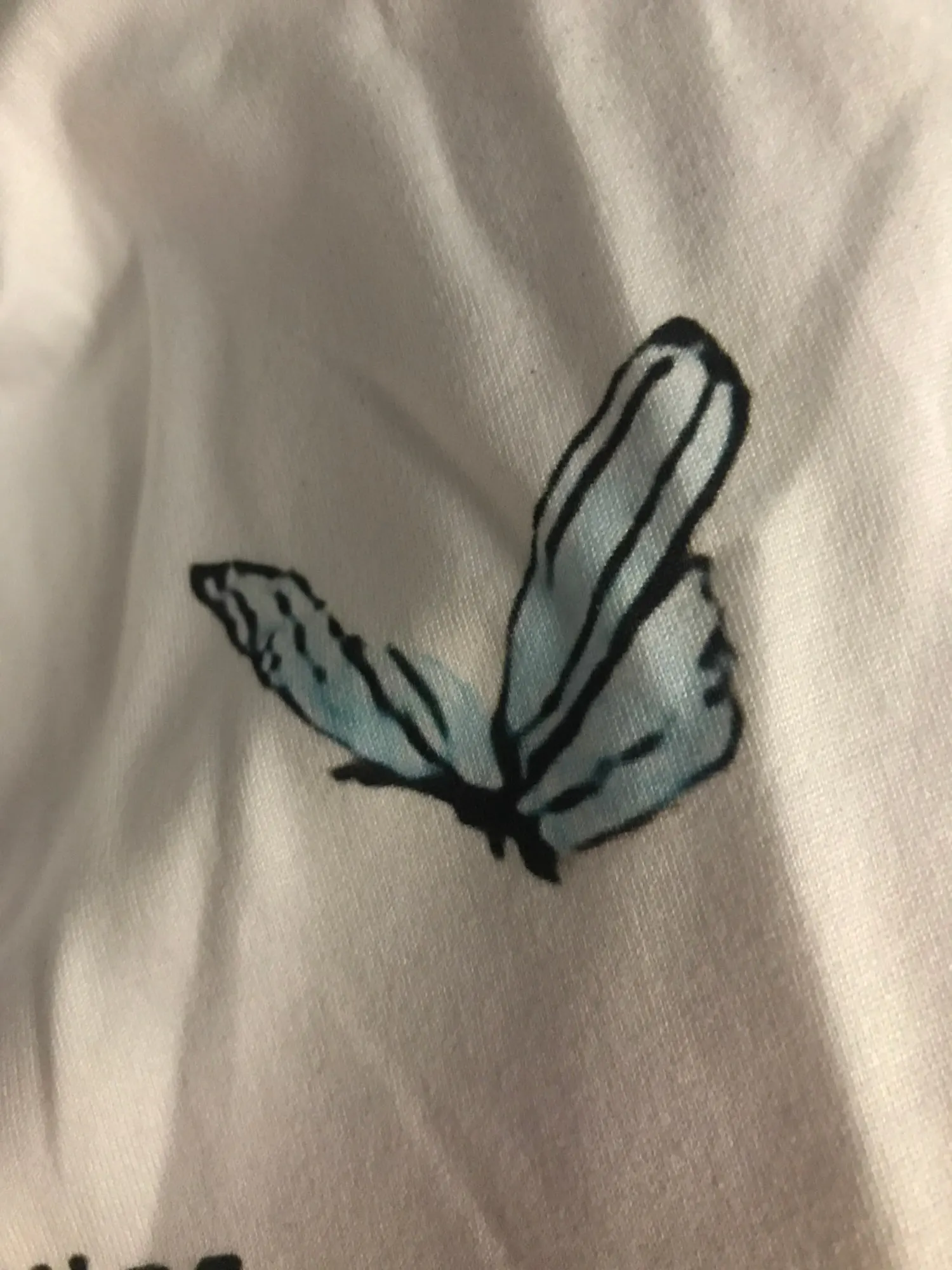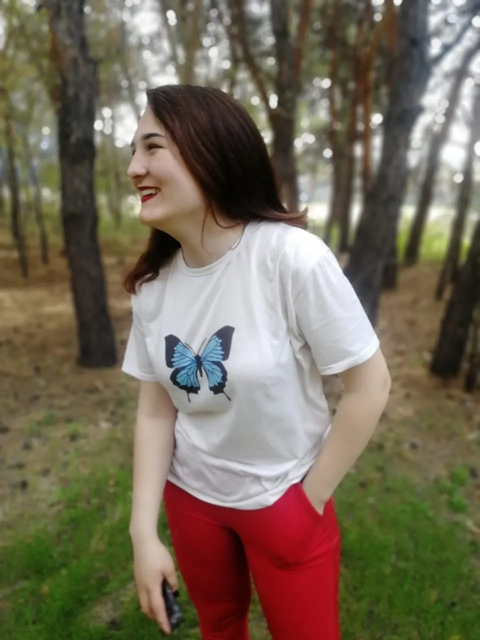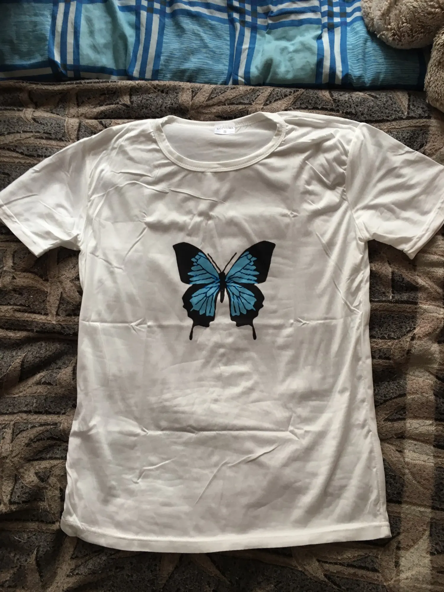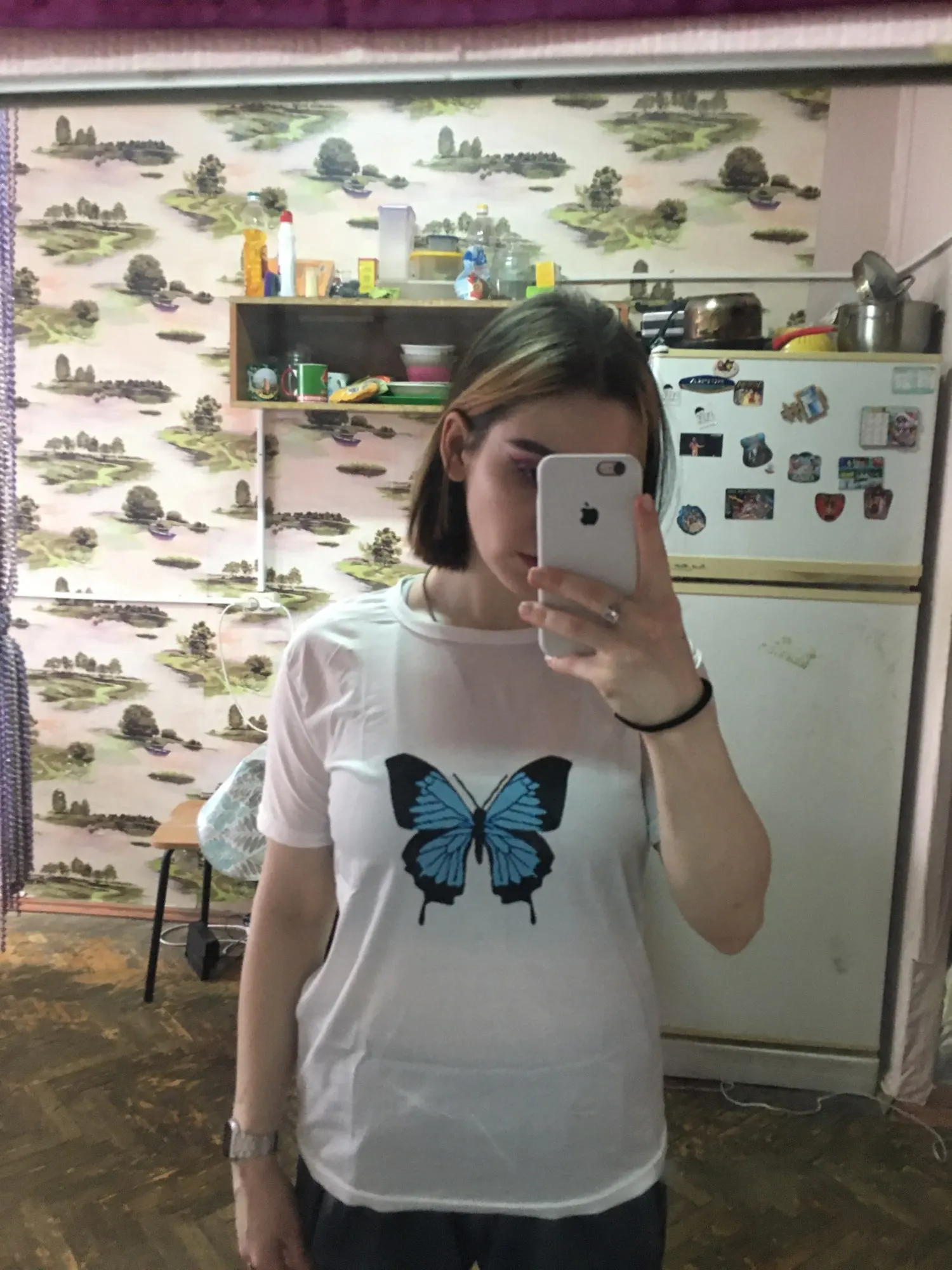 Футболка очень легкая, бабочка на ней в жизни на самом деле не очень , да и материал тоже не похож с тем, что на фото. Если и брать такую футболку , то точно больше своего размера, так как на свой “s” футболка оказалась в обтяг, нужно брать на 2 размера больше, тогда смотреться будет лучше . Из "+" товар пришёл очень быстро