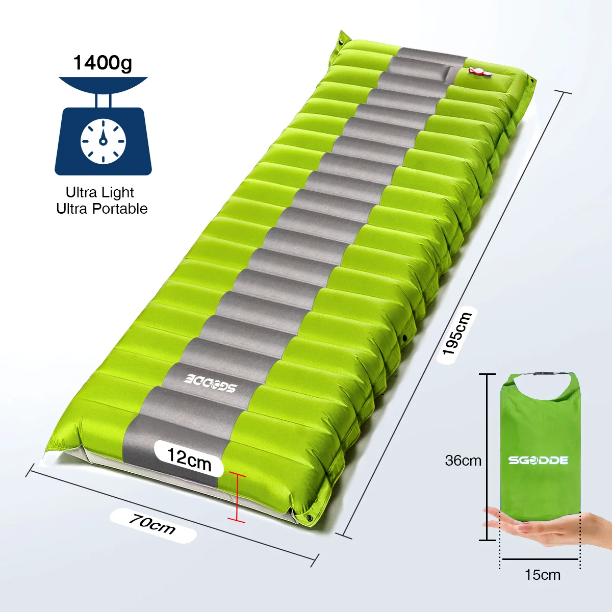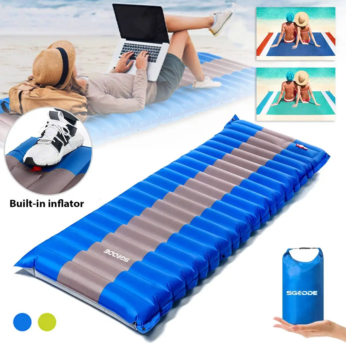 Посылка: 1 х спальный коврик для кемпинга 1 х сумка для хранения Размер: 195х70 см Дополнительный цвет: синий; Зеленый Материал: 80d полиэстер понги с ПВХ покрытием
