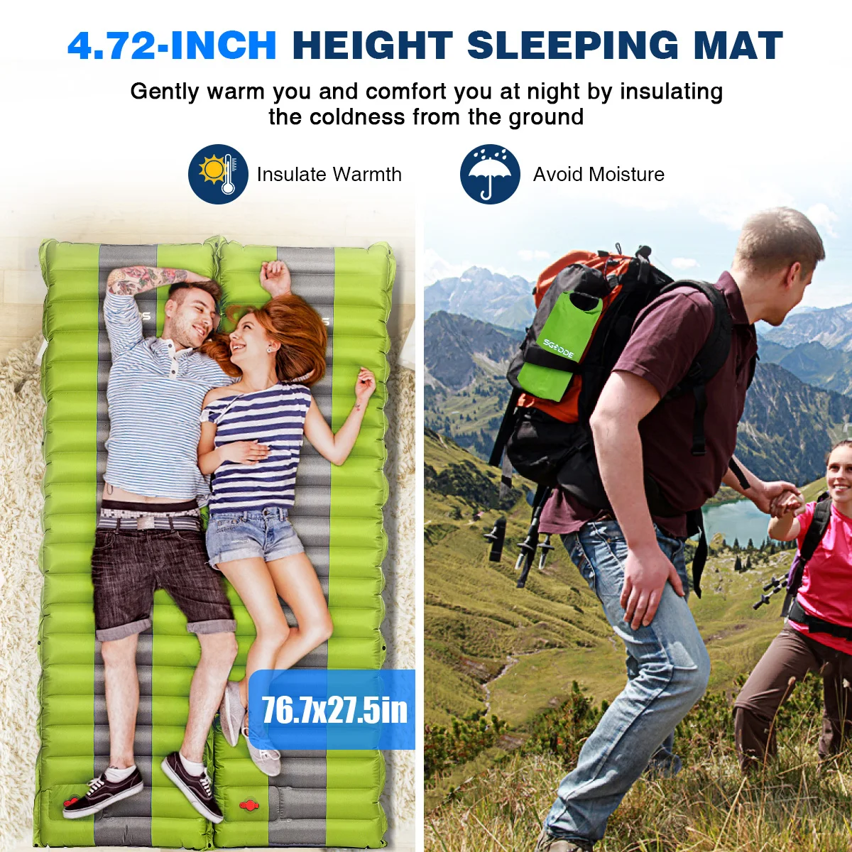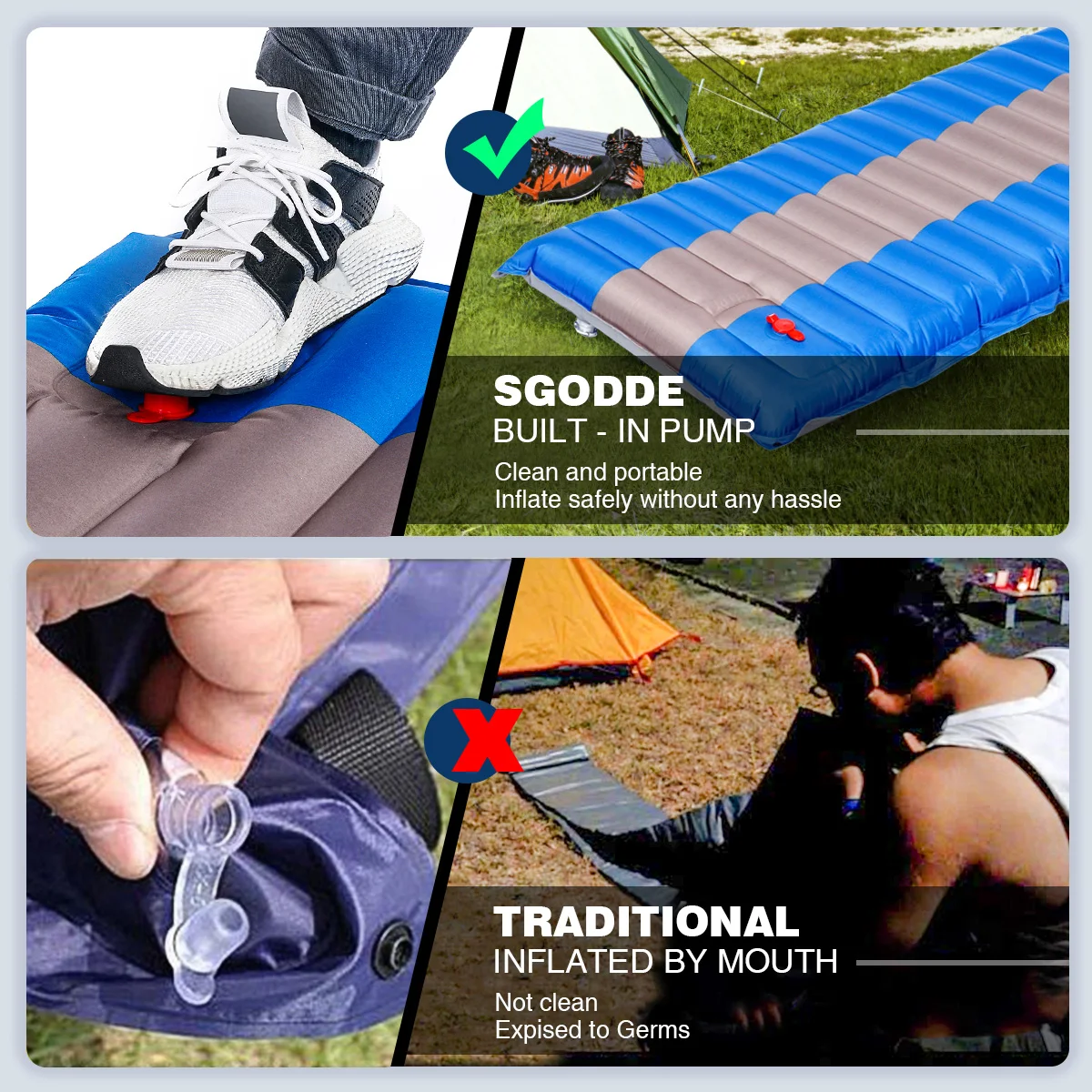【Встроенный в тыкве может быть двуспальная кровать! Поставляется с боковыми кнопками для крепления на другой надувной коврик, чтобы получить двойную кровать.! Гораздо проще в использовании! Больше не продувать воздушный матрас! Наш матрас для кемпинга оснащен встроенным насосом для ног, поэтому вы можете надуть ваш коврик для кемпинга в течение всего 3 минут. Одна ступня находится на отверстии, другая-в шаге от отверстия. Повторите это, и все готово! Также легко сдувать-просто выньте вилку дефляции, которая может эффективно надувать. 【Удобный и компактный 】 подарите вам легкий спальный коврик без ущерба для комфорта. Наши коврики для отдыха на природе взять появление волнистая поверхность и увеличили толщину и плотность до 4,72 ", чтобы дать вам комфорт как дома. Он изготовлен из водонепроницаемого, прочного и стойкого к разрыву материала, конструкция поверхности трубки соответствует изгибу тела, принесет вам хорошую ночь даже в вашей поездке на свежем воздухе. Больше нет боли в спине или неприятного дискомфорта. 【Прочный материал 】изготовлен из оптимального 80D полиэфирного понга с ПВХ-покрытием, которое невозможно утечить воздухом и водонепроницаемым слоем ТПУ. Он влагостойкий и не пропускает воздух, он может быть плавающим матрасом для вас, чтобы принять замечательную солнечную ванну, но определенно не экономит жизнь. Идеально подходит для хранения под спальным мешком, в гамаке или на любом полу или твердой поверхности. 【LIGHTWEIGHT PORTABLE】 вы получите площадку, которая хорошо упакован в маленькую сумку (только в том случае, 14,1x5,9 "). Этот компактный спальный коврик весит 3,08 фунтов, вы можете легко взять его в любом месте, он поставляется с сумкой для переноски, сдуйте его и сложите в сумку, которая будет занимать мало места в вашем рюкзаке. Куда бы вы ни отправились, Для Пикника в парке, походов на кемпинг, пляжной ванны или посещения дома, это всегда будет удобно для сна.
