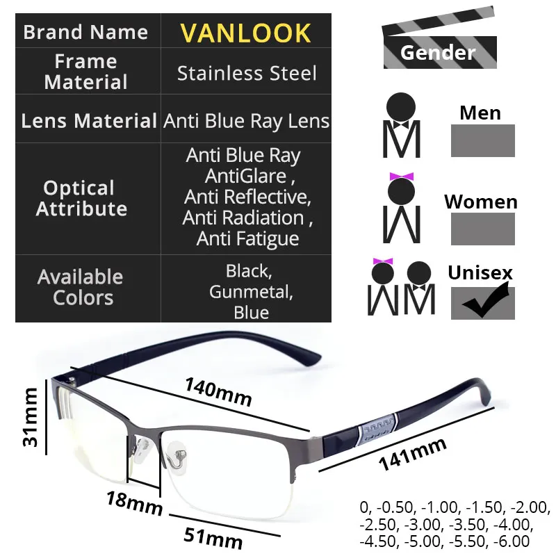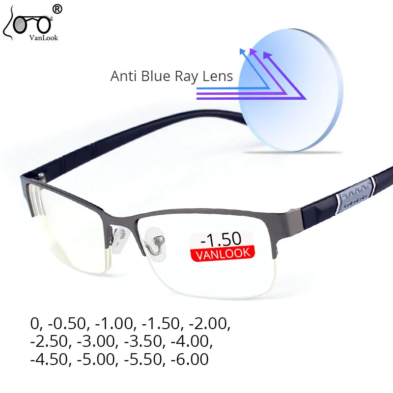 Очки для близорукости мужские с защитой от синего излучения, аксессуар для работы за компьютером, полуоправа, 0-0,50-1,0-1,50-2,00-2,50-4,00-4,50-5,00-5,50-6,00