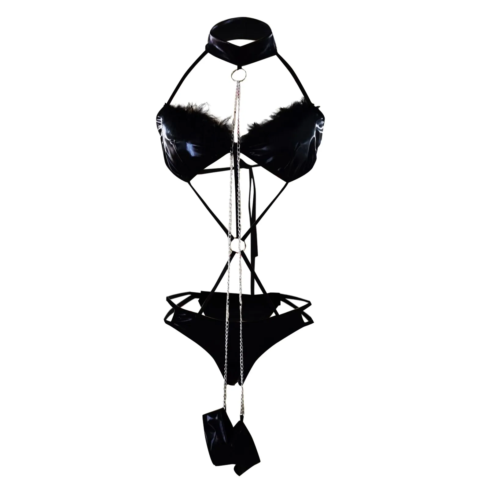 Сексуальный комплект женского нижнего белья большого размера 2021 модное черное Лакированное сексуальное боди возбуждающие наручники порно белье комбинезон секс P
