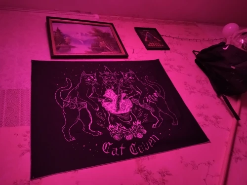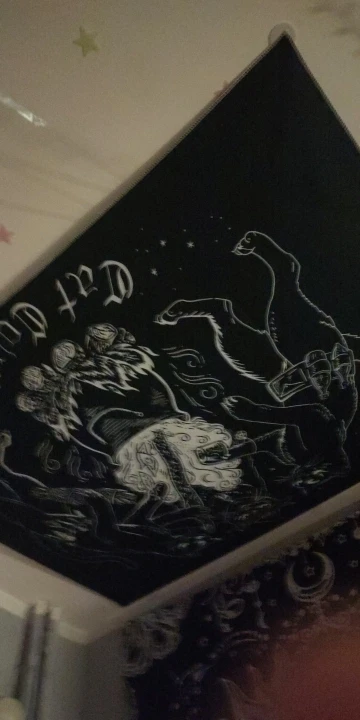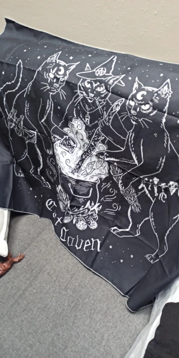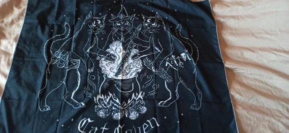 края прошиты без подворота, что мне не очень понравилось, тк стянуло немного сам гобелен, остальное все хорошо. цвет яркий, изнанка синяя! не пахнет. продавец положил 4 двусторонних крепления. буду использовать как скатерть для гадания скорее всего