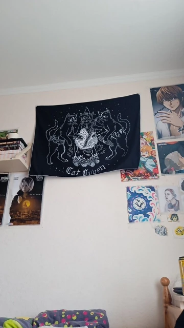 Всё пришло очень быстро! Для фиксации на стене продавец положил двусторонние липучки. Кст намертво фиксируют, мои котики висят только на двух таких липучках) Советую сначала погладить, прежде чем вешать на стену, ибо гобелены пришли в свернутом виде. Ткань тонкая, но непрозрачная. Мне всё нравится))