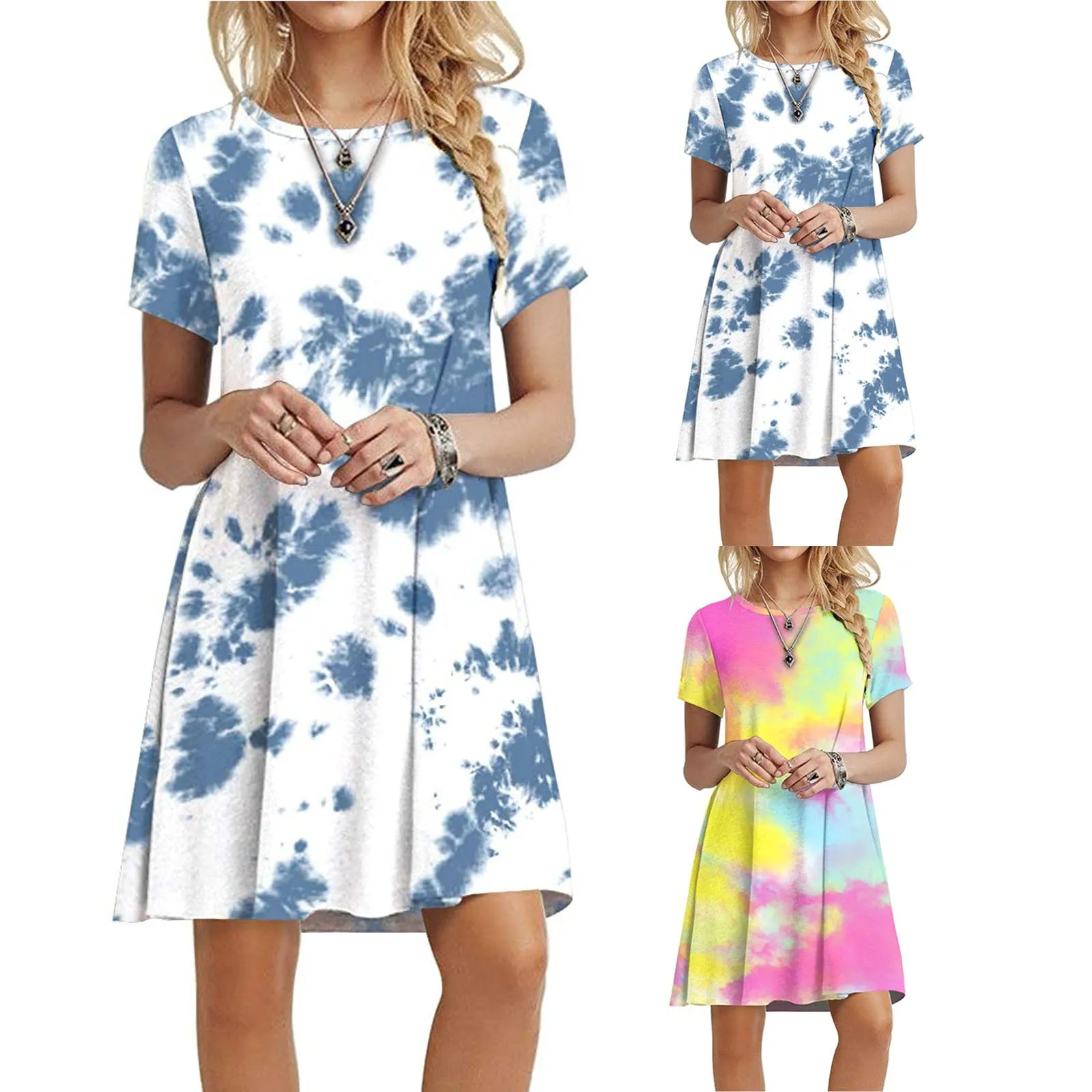 Женское Платье с коротким рукавом, круглым вырезом и принтом тай-дай, Лето Свободное Платье с рисунком