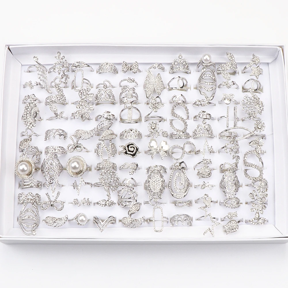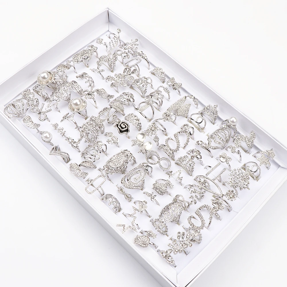 Оптовая продажа 50 шт.лот изысканный, стразами и металлическими элементами ювелирные кольца для женщин покрытые серебром вечерние подарок с коробкой в разных стилях