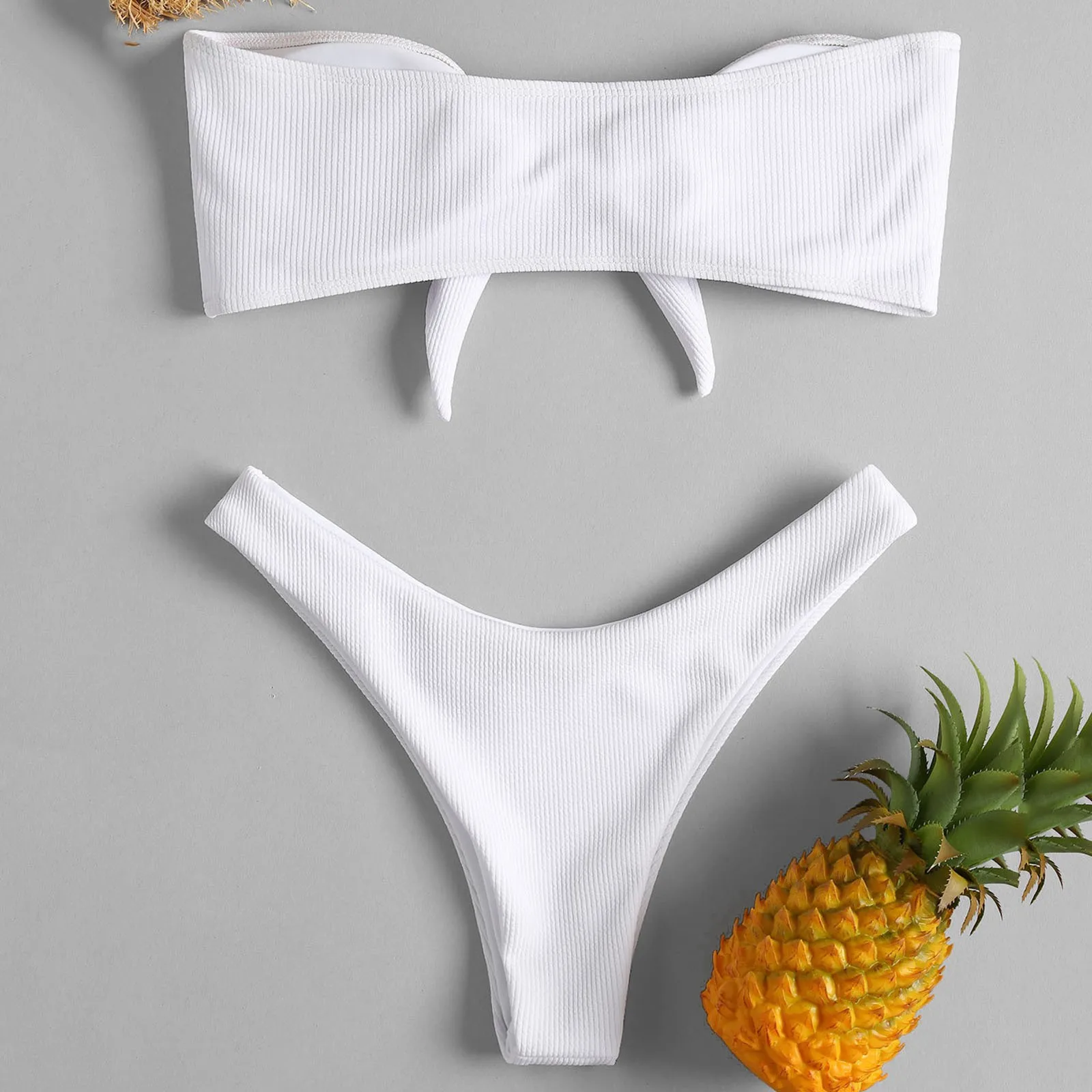 Пляжное бикини 2021, женский сексуальный спереди со шнуровкой, без бретелек, однотонный ребристый купальник, женский купальный костюм с пуш-апом и бантом, купальник 0311