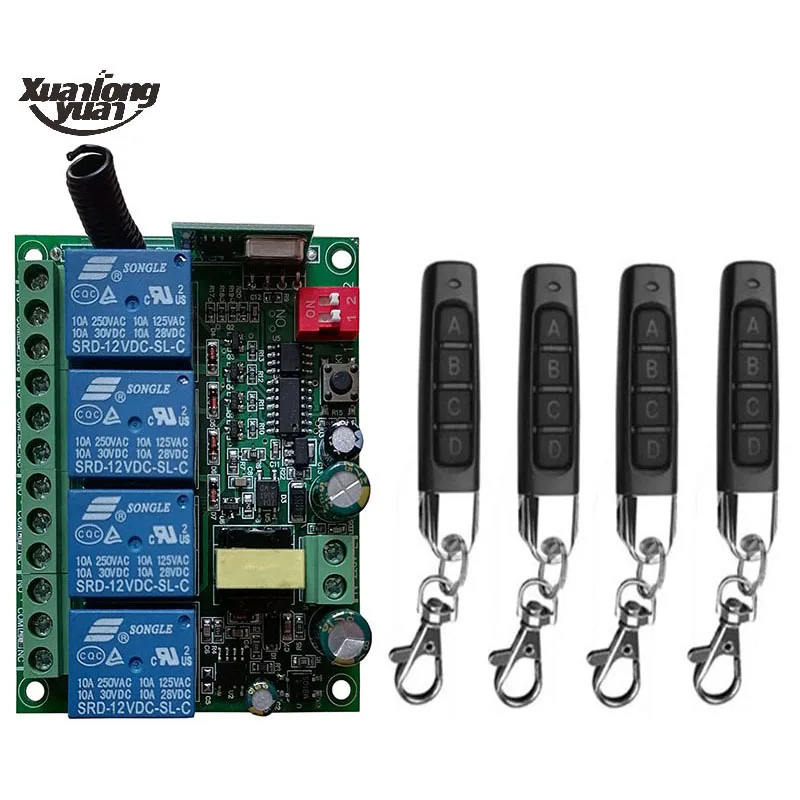 Пример: модель APAC - 4 sI. Обзор продукции:Компания проектирует и производит многофункциональный переключатель управления беспроводной связью для четырех релейных выходных сигналов, может сделать для управления оборудованием или электрическим переключателем или прохождения, преобразования и различных специальных программ управления. Он в основном используется в электрических дверях, окнах, подъемном оборудовании, воротах, лифтах, промышленном контроле и освещении и электрическом контроле.Беспроводной контроллер, приемник с высокой конфиденциальностью, стабильной производительностью, характеристикой низкого энергопотребления и прост в использовании, без традиционной линии переключения или набора кодового переключателя, просто положите пульт дистанционного управления с принимающим контроллером для изучения кода можно реализовать. Есть четыре вида режимов вывода: самоблокировка, Точечное движение, блокировка, самоблокировка и трехстороннее движениеФункция разбора1) Режим пробежки: не набирайте переключатель кода2) Режим самоблокировки: переключатель кода набора 1,2 для включения для самоблокировки3) Режим блокировки: переключатель кода набора 2 для включения для блокировки4) режим бега + самоблокировка: переключатель кода набора с 1 на 1 на 1,2 на 2 джога; 3,4 самоблокировка