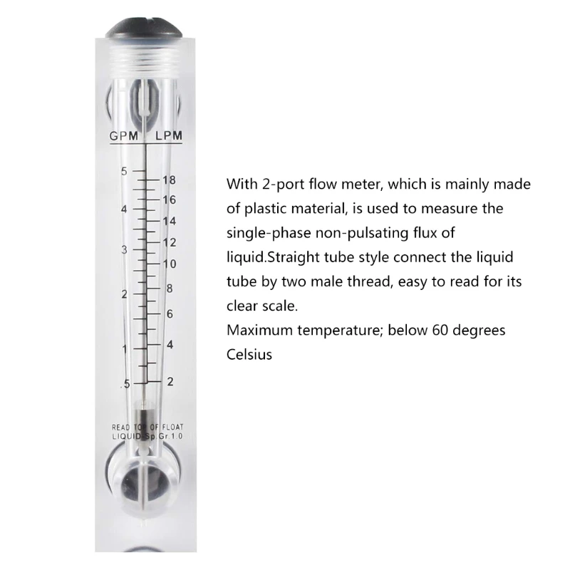 С 2 портами расходомер, который является главным образом из пластикового материала, используется для того чтобы измерить однофазные non-пульсирующий поток жидкости. Прямой стиль трубки соединяет жидкую трубку с помощью двух мужских нитей, легко читается с ее ясным масштабом.