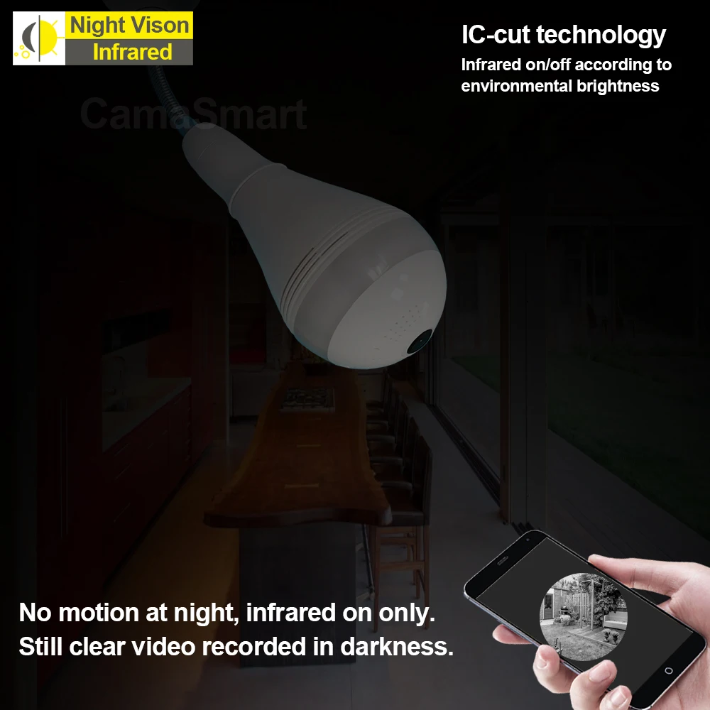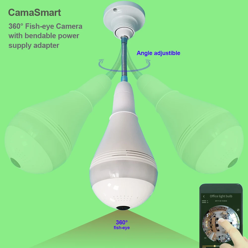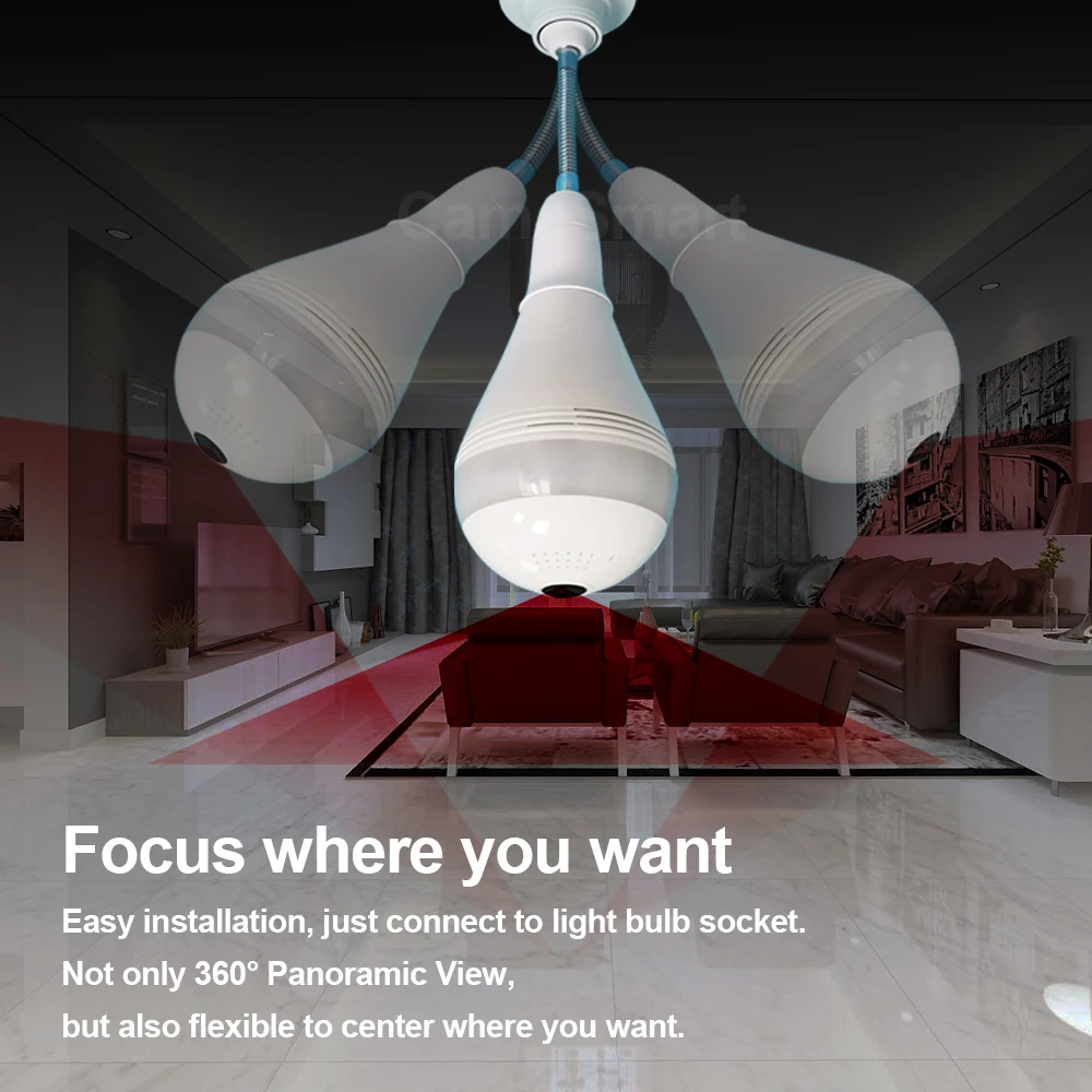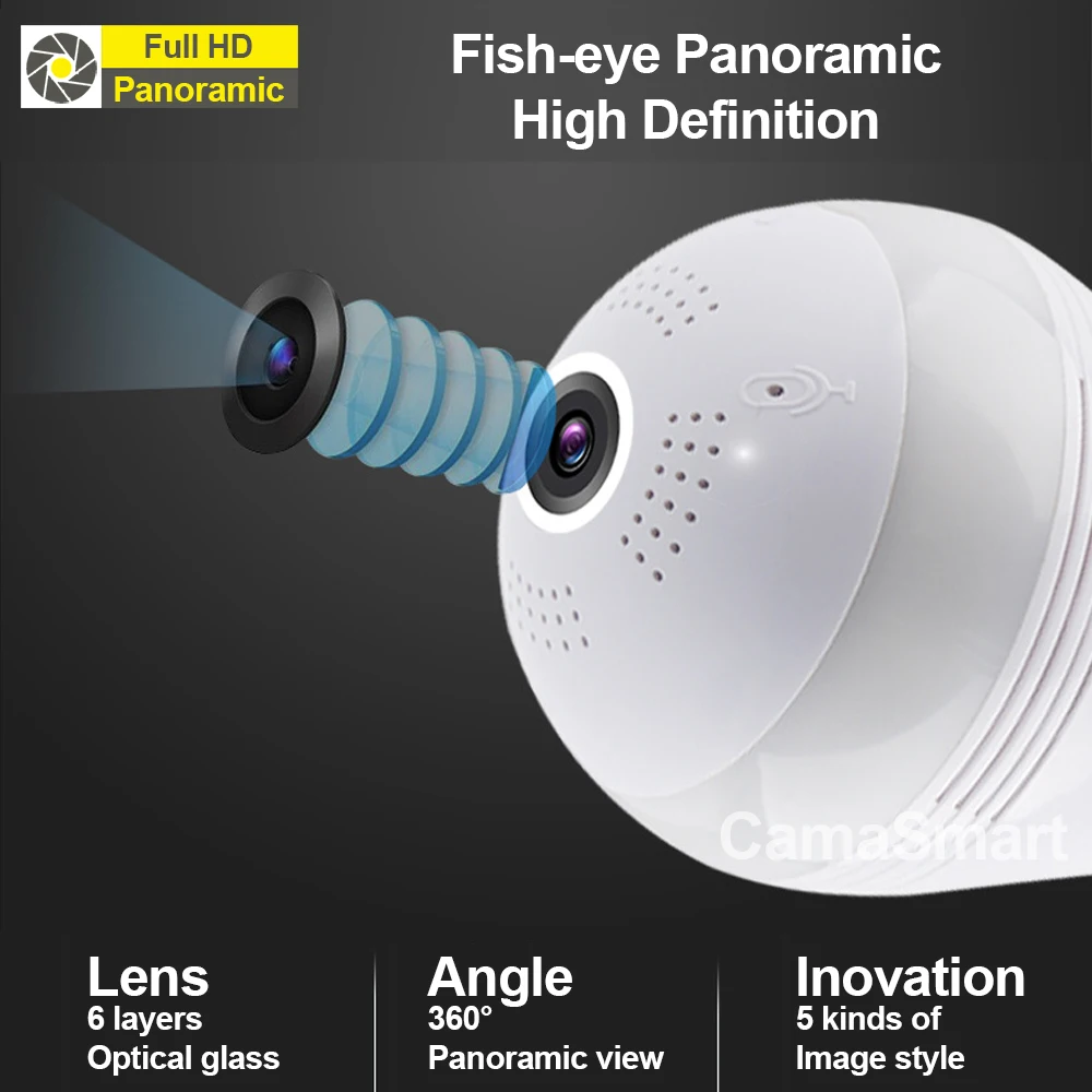 Датчик: Высокопроизводительный датчик Линзы: линзы Рыбий глаз Вид: 360 ° панорамный Аудиовход: Встроенный микрофон Хранение: Поддержка TF-карты до 128 ГБ Крепление: E27 Рабочее напряжение: 100-240 В переменного тока, Гц Мощность: ≤ 6 Вт Видео: H.264 + Основной профиль Максимальный размер изображения: 1088*1080P