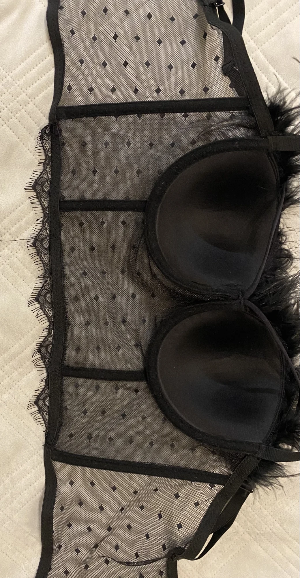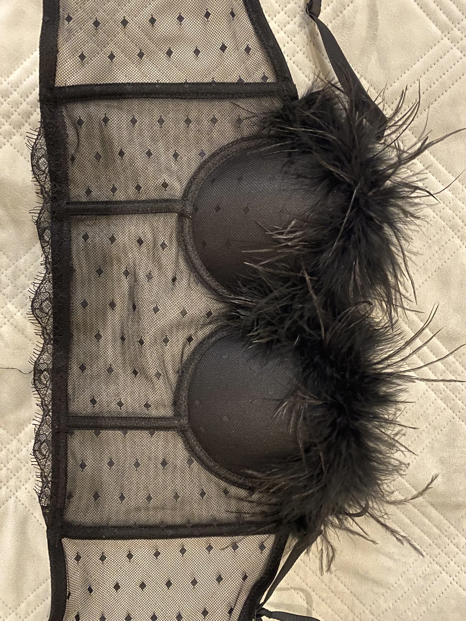 Топ хороший, кое-где торчат нитки, но не критично, можно обрезать. Перья пришиты хорошо, конечно чуть-чуть вылазят, но это естественно. Одно большое НО! Он большемерит на размер, а то и на два. На мой ОГ 90 чашки большие, придется как-то умудряться ушивать. Смотрится красиво. На WB такой же абсолютно стоит 2300.