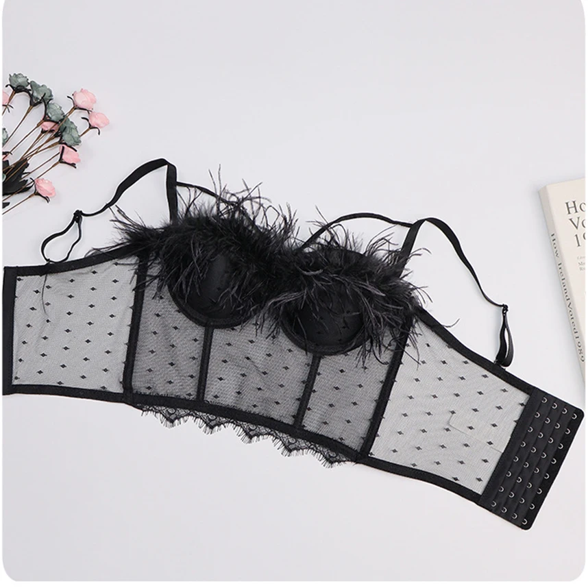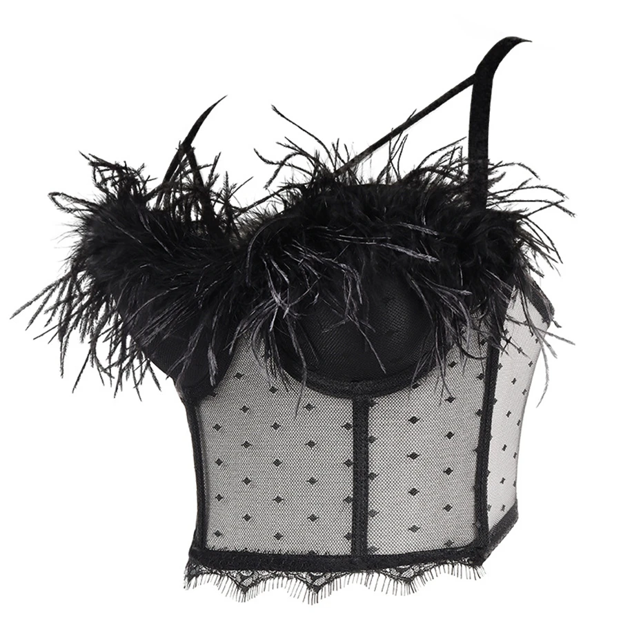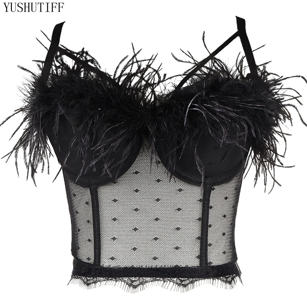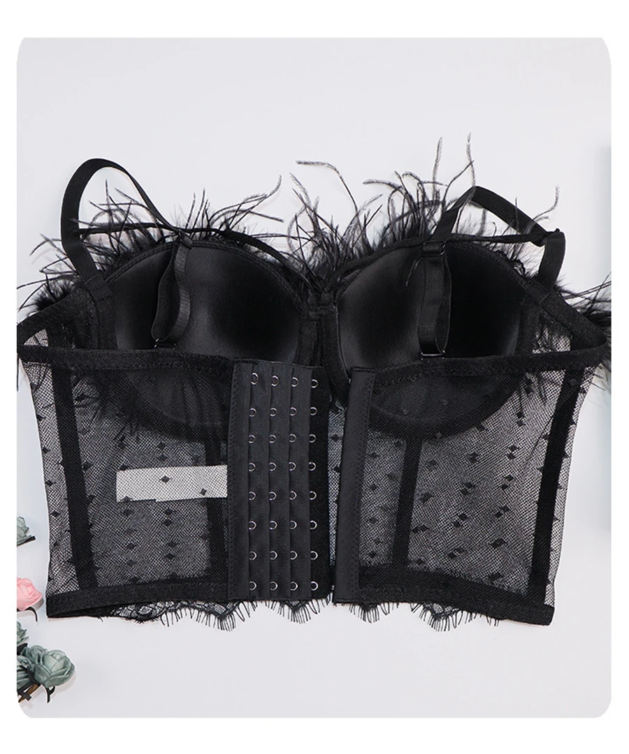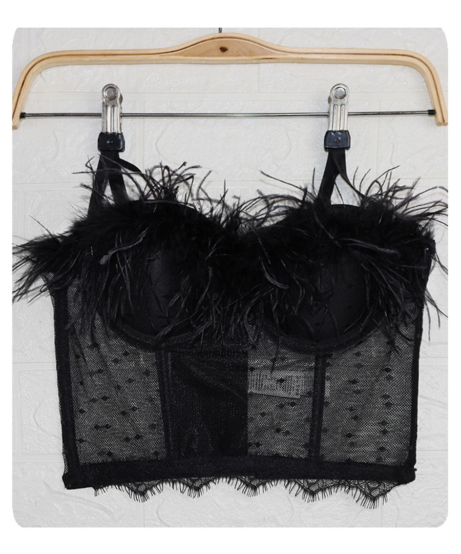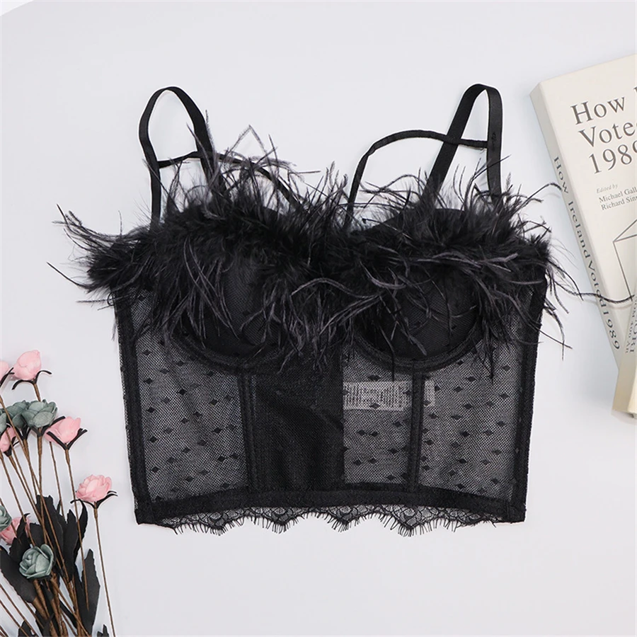Майка женская кружевная прозрачная, пикантный укороченный топ с перьями, однотонный топ со встроенным бюстгальтером с чашками пуш-ап, бюстье без косточек