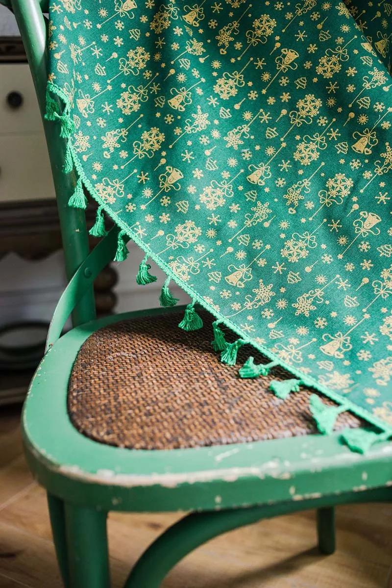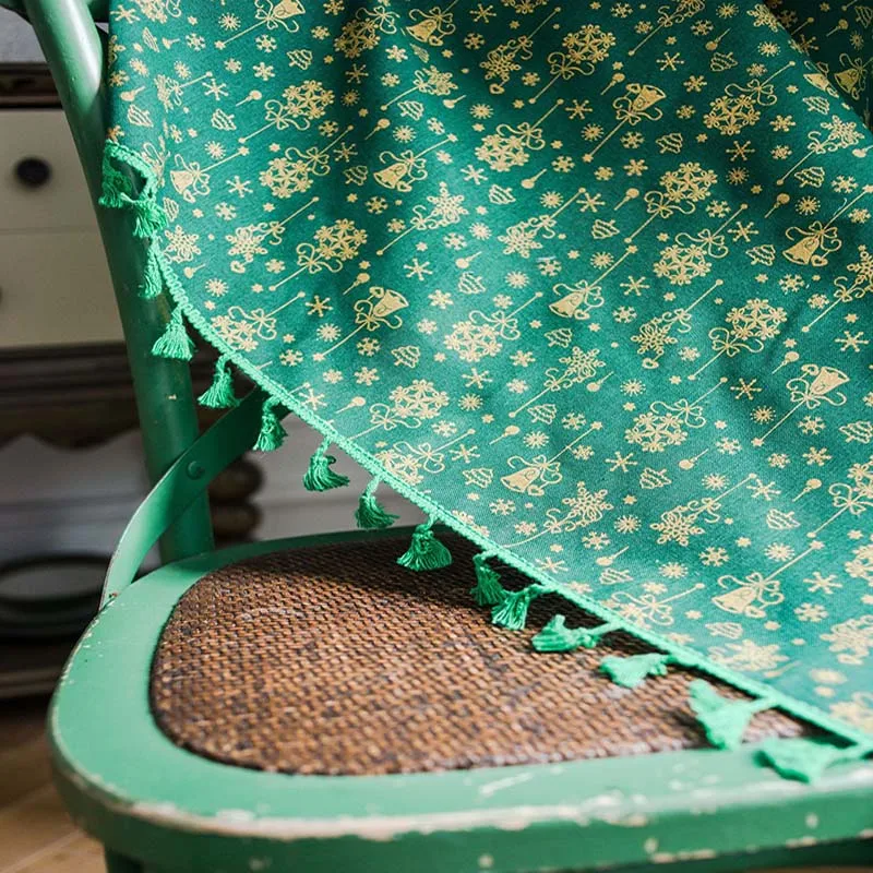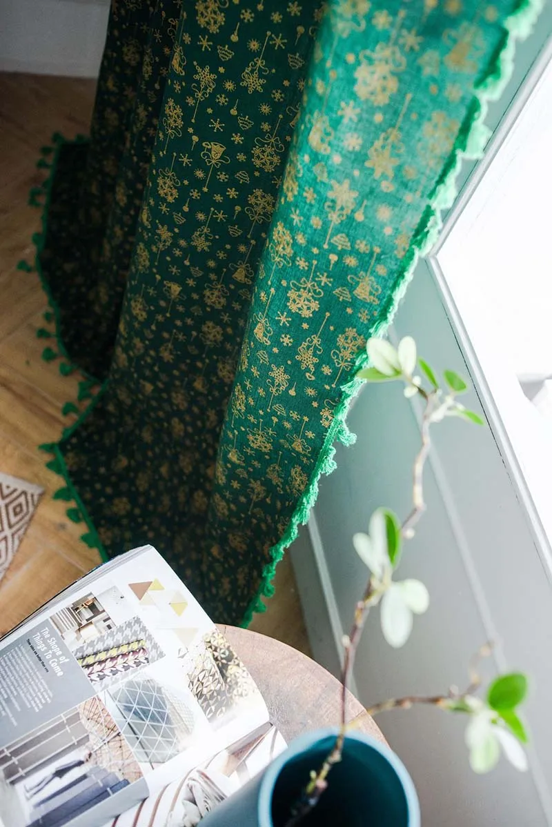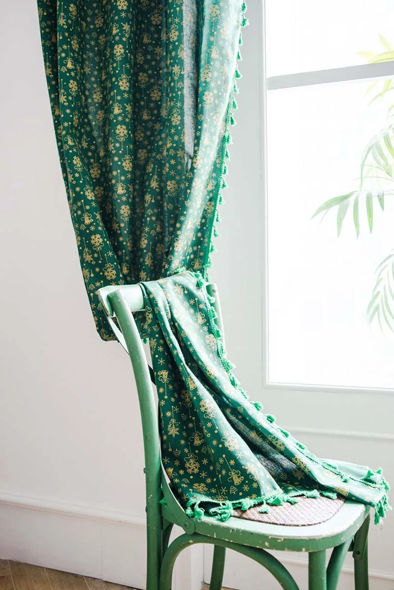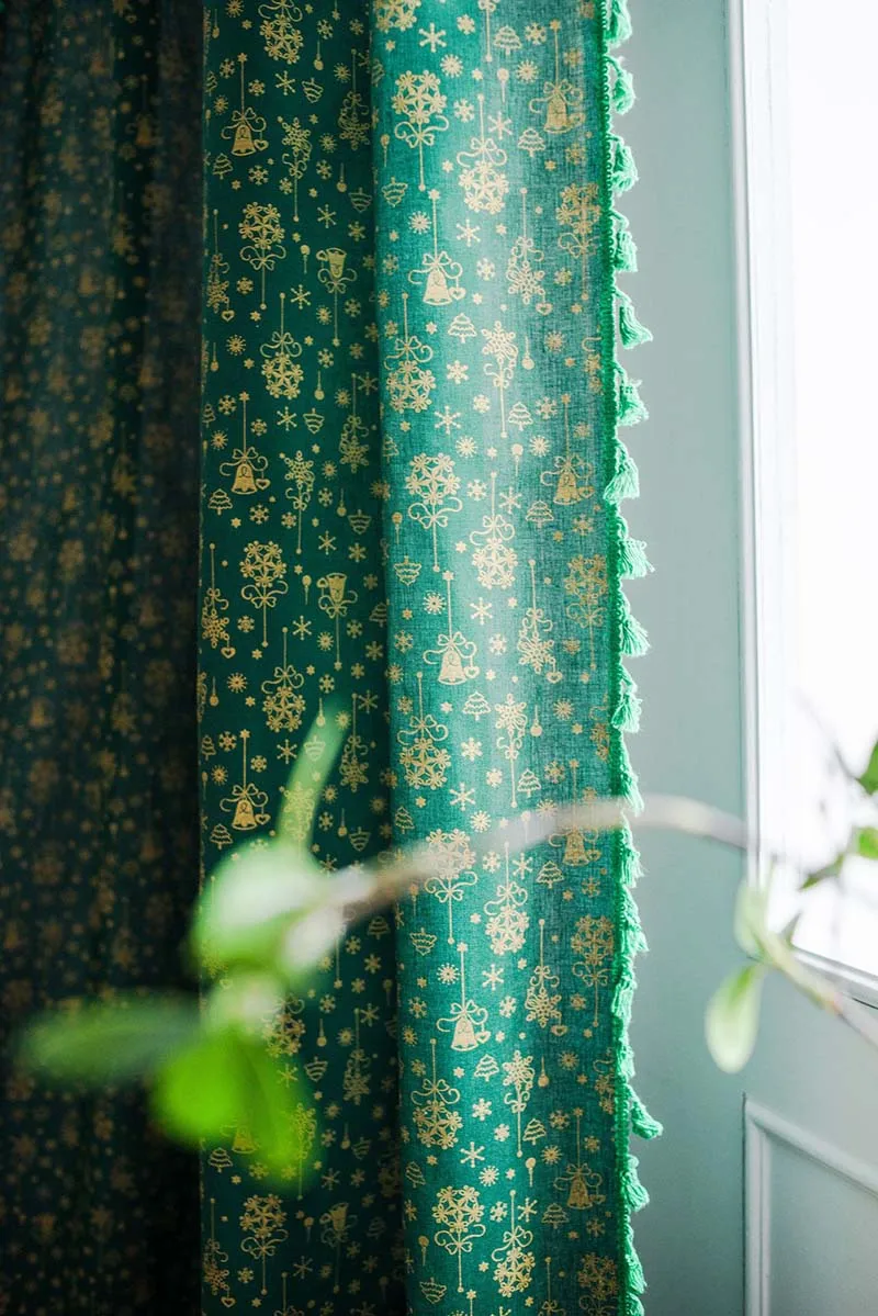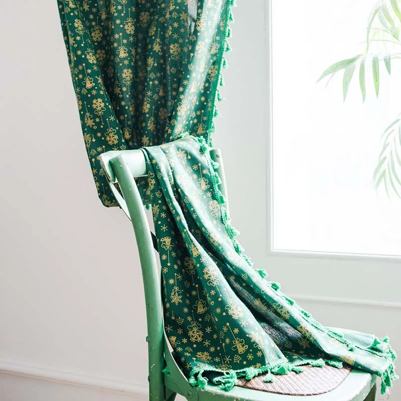 Рождественская зеленая занавеска с кисточками для гостиной, спальни, кухни, кафе, плоская оконная занавеска с золотым принтом снежинки, Readymade