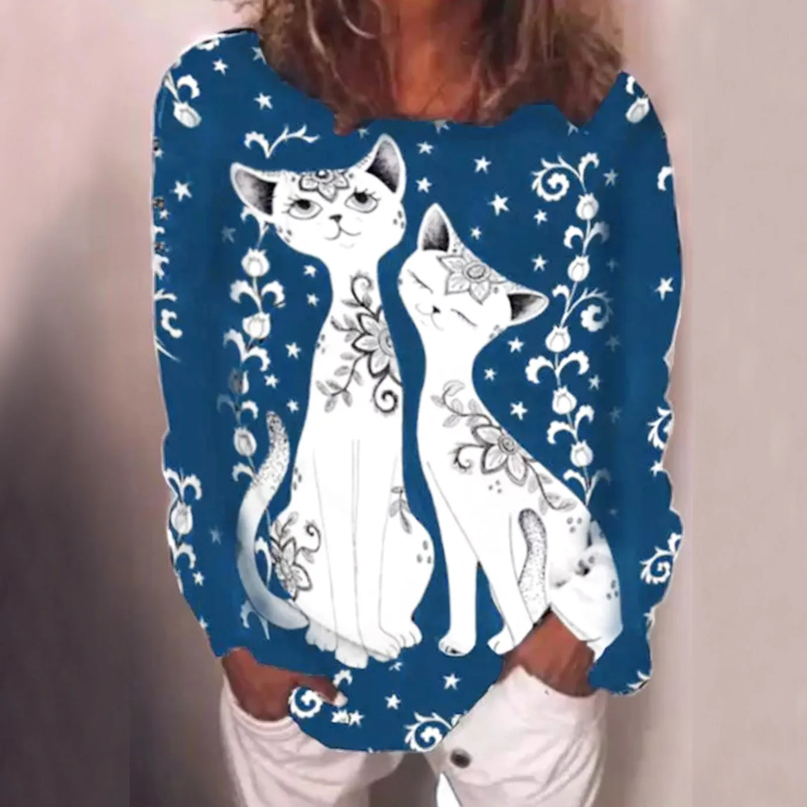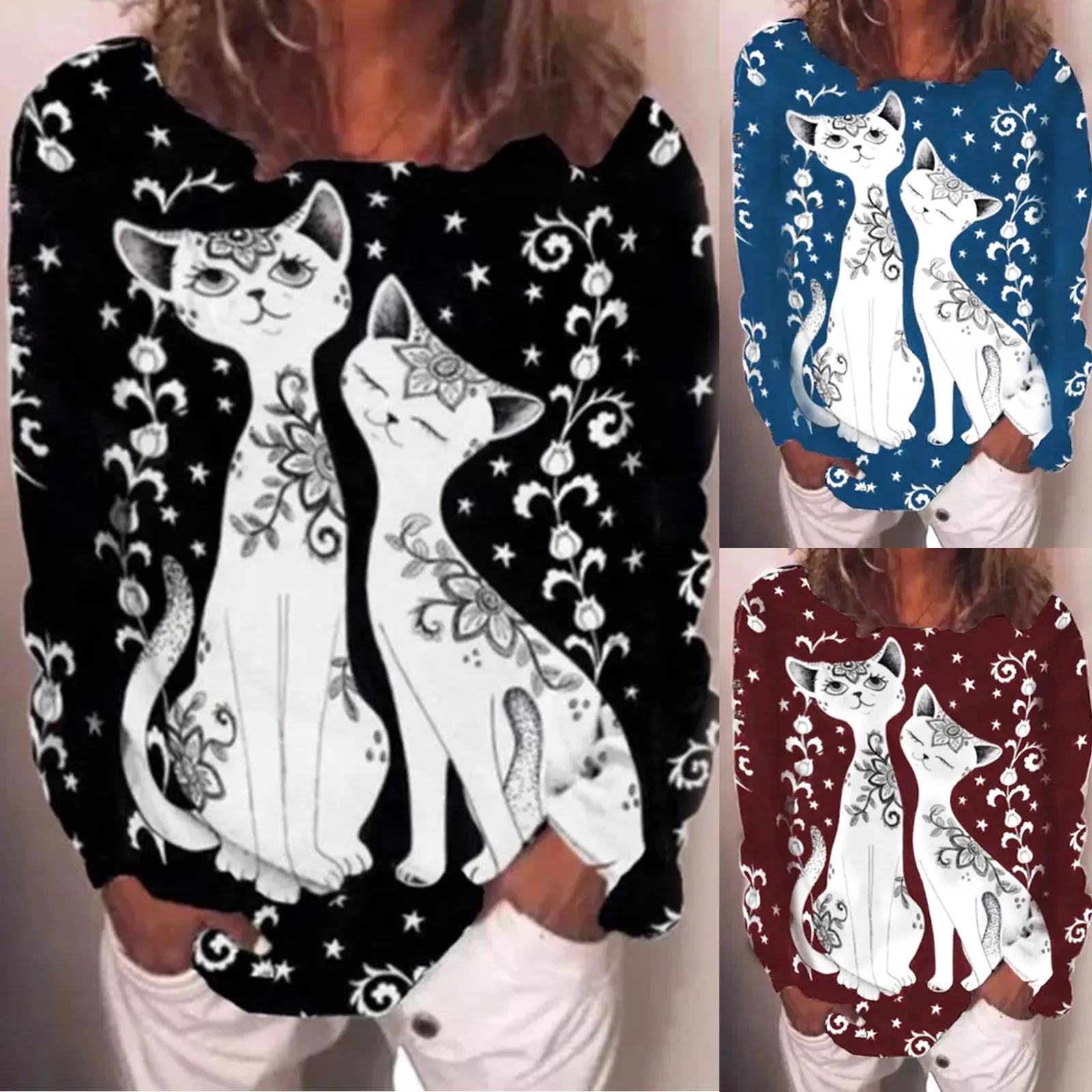 Женский осенне-зимний свитер 4 # с котом, с круглым вырезом и длинн...
