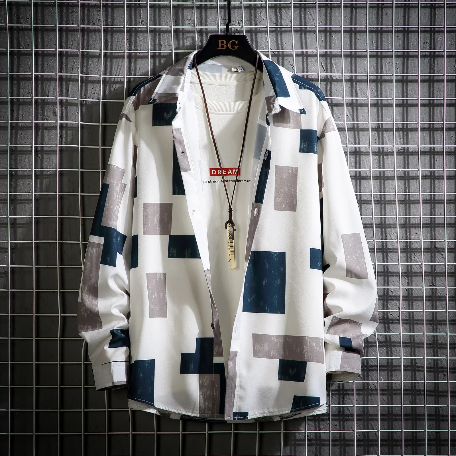 Мужская рубашка с длинным рукавом и отворотом, свободная рубашка в клетку с цветочным принтом