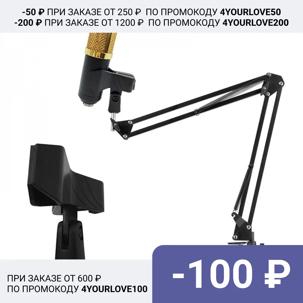 Крепится к столу или другим плоским поверхностям при помощи струбцины. Подходит для динамических и не очень тяжелых конденсаторных микрофонов весом до 600 г.Подходит для тех, кто делает первые шаги в записи подкастов, стримов или видеоблогов.Характеристики::- Вид стойки: настольная;- Длина пантографа: 80 см;- Нагрузка на стойку: до 0.6 кг;- Подойдет для микрофонов весом: до 0.6 кг;- Размеры (в собранном состоянии), см: 40 x 11 x 5;- Диаметр резьбы для держателя микрофона: 3/8";- Ширина зажима для крепления к столу: 4.8 см.В комплекте: стойка, держатель для микрофона «прищепка», струбцина.Важно: микрофон приобретается отдельно.Важно: закручивайте струбцину умеренно сильно, иначе струбцина может прийти в негодность.Важно! Максимальная нагрузка на стойку 600г, это значит: микрофон, держатель "паук", поп-фильтр должны в сумме весить 600 г, иначе пантограф не удержит все оборудование и будет падать.Внимание! При правильно расположении пантографа в струбцине возможен небольшой люфт.