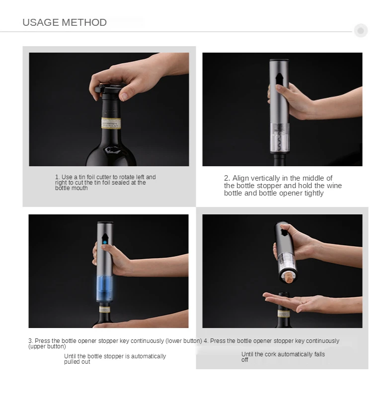 1. Используйте оловянную фольгу, нож вращается влево и вправо, чтобы разрезать оловянную фольгу, запечатанную в горлышке бутылки