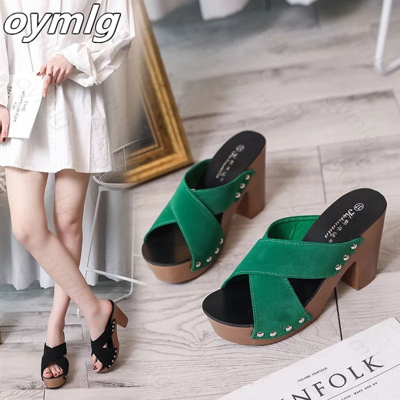 Сандалии женские на платформе и высоком квадратном каблуке, повседневные туфли-лодочки из флока, с заклепками и открытым носком, Элегантная Дамская обувь, лето