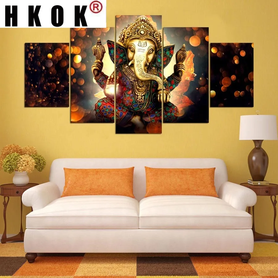 Холщовая картина HKOK, настенное искусство, домашний декор, 5 панелей, Ганеш, слон, ствол, Бог, Современная печать, пейзаж, картина, декор для гостиной