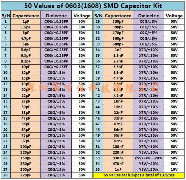 0603 SMD конденсаторы, 55 типов, всего 1375 шт