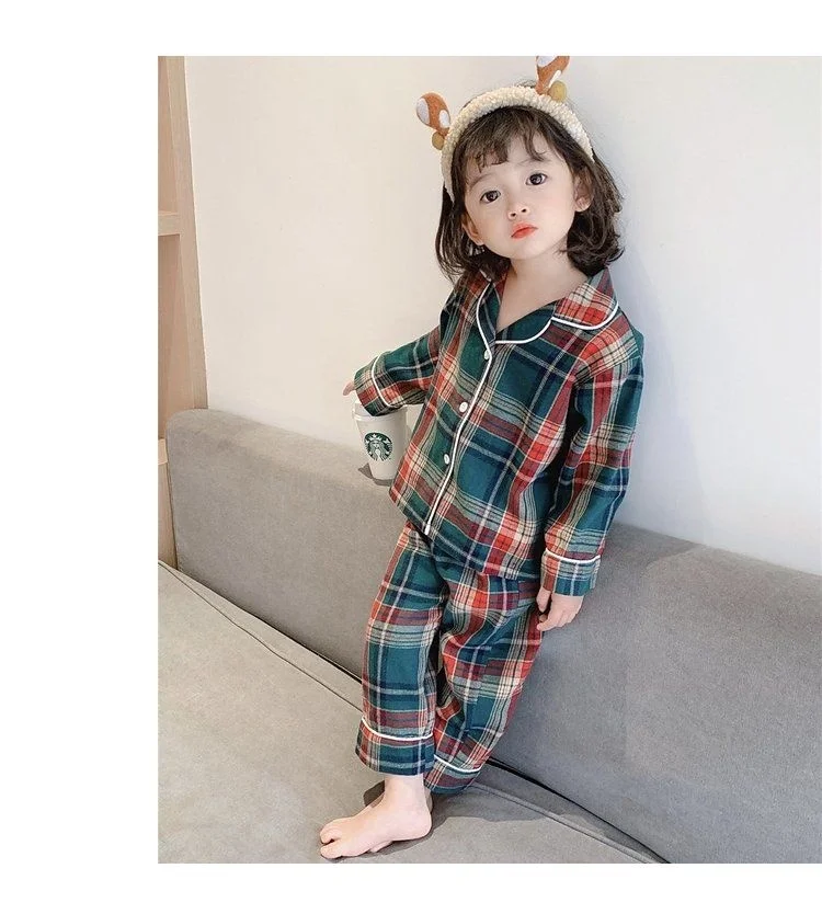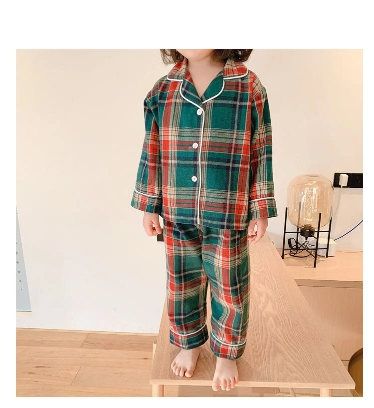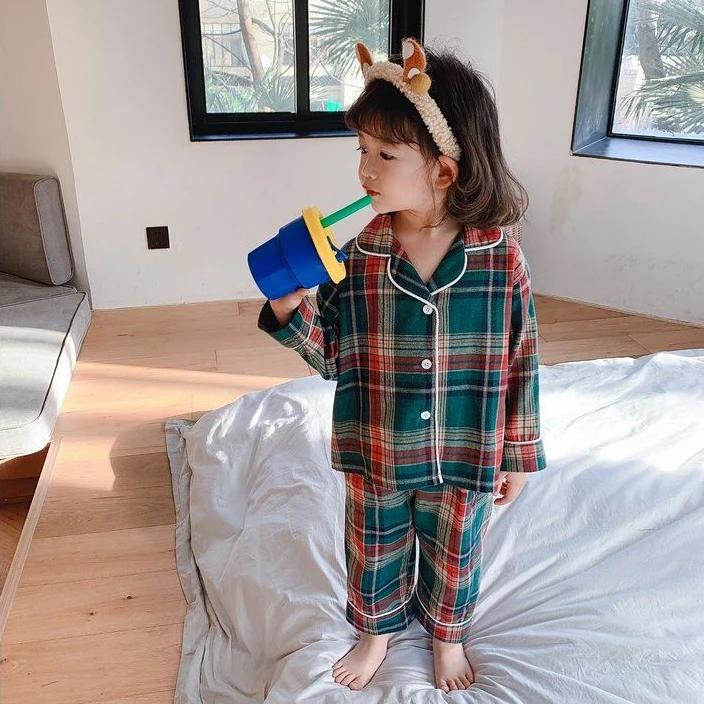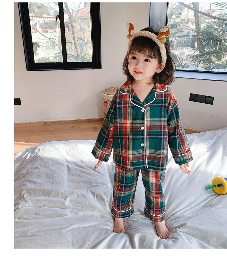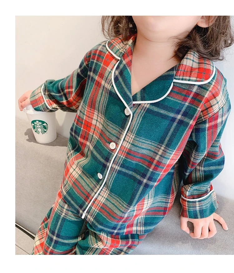Пижамный комплект для девочек, с отложным воротником, 2 цвета, клетчатая Пижама контрастных цветов, кардиган, одежда для сна, детская одежда