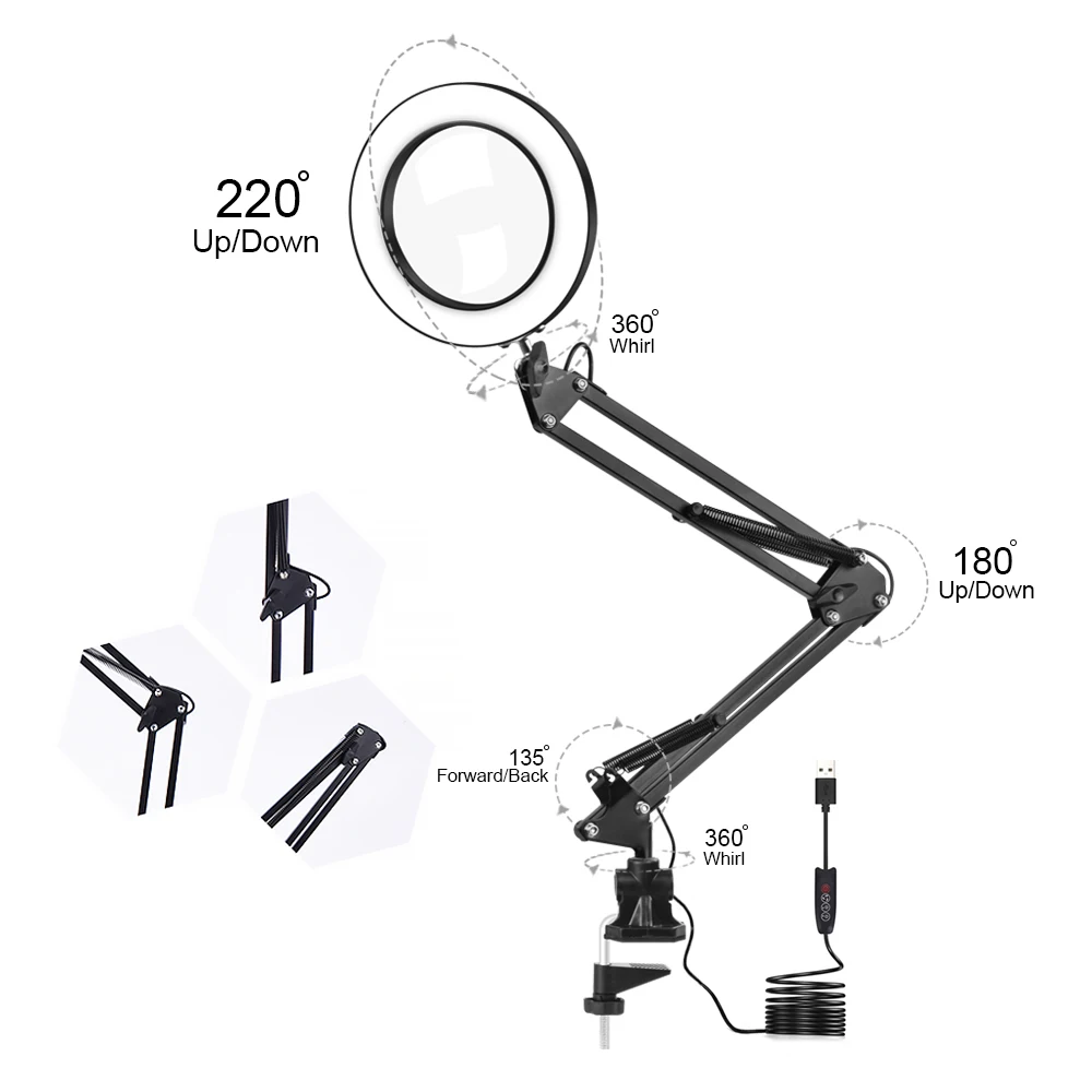 1. Прочный зажим может быть закреплен на любой плоской поверхности, толщиной менее 2 ''/ 5 см (макс.). Экономит место, удобно крепится к столу, верстаку.2. Головку лампы можно отрегулировать на 220 ° вверх и вниз и поворачивать на 360 °. 22 см + 22 см выдвижные длинные руки, 180 °/135 ° можно регулировать.3. Энергосберегающий и яркий светодиодный светильник, без мерцания, без излучения, который поможет защитить ваши глаза.4. Конструкция разъема USB делает его более удобным в использовании, вы можете подключить его к компьютеру, блоку питания, адаптеру и т. д.5. Увеличительное стекло с светодиодный светильник, цветовая температура светодиодный светильник может быть скорректирована в 3 шага и яркость может быть скорректирована в 11 шагов, он может удовлетворить различные рабочие среды.6. Подходит для чтения, татуажа бровей, тату, маникюра, наращивания ресниц, пайки и т. д.