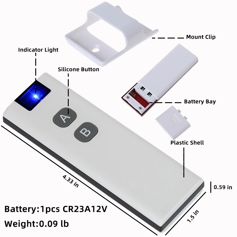 Рабочее напряжение: 85 ~ 265 В переменного токаМаксимальный ток:15аТок нагрузки: 3000 ВтРазмер: 51*99*73 мм (2,0*3,9 * 2.87in)Вес: 105 гЧастота RF:433 МГцРабочая температура:-30 ~ + 80Чувствительность приема:> 97dbmКоличество пульта дистанционного управления:25 шт.Поддержка кодирования:1527 код обученияРежим работы RF:Спросить Супергетеродинный беспроводной приемДиапазон приема:Открытое пространство более 50 метровДистанционный режим работы:Режим переключения/режим блокировки