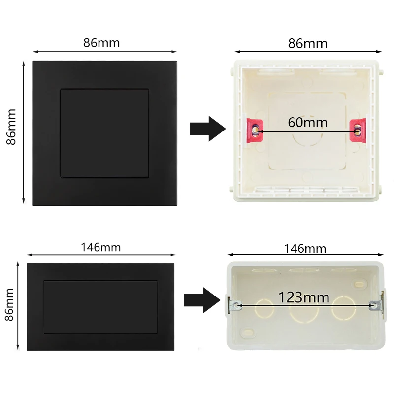 ✔✔✔1. Этот продукт не может быть совместим с круглой монтажной коробкой. ✔✔✔2. Пожалуйста, обратитесь к рисунку ниже в соответствии с размером гнезда, чтобы получить количество установочных коробок, подходящих к розетке