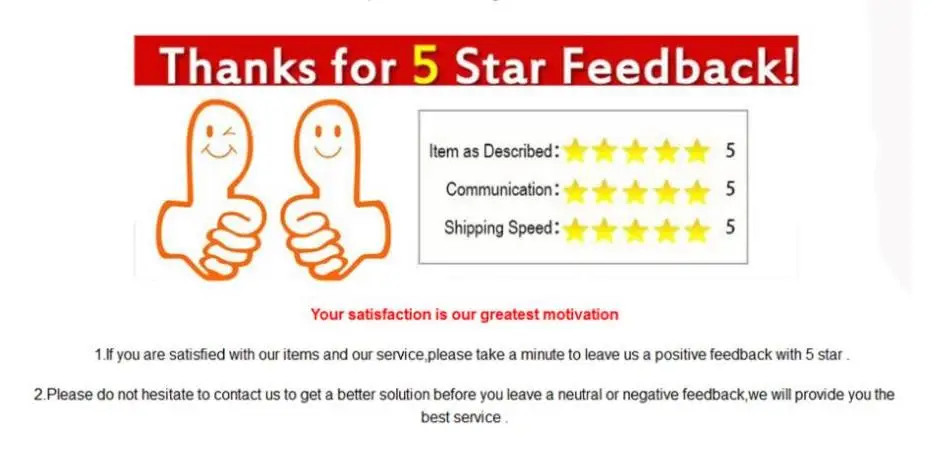 Доставка всех товаров будет отправлена в течение 5 рабочих дней после оплаты. Отзывы ваши отзывы очень важны для нас. Если вы довольны нами, пожалуйста, не забудьте оставить нам положительные отзывы (5 звезд). Если у вас есть недовольство, пожалуйста, дайте нам возможность решить проблему, прежде чем оставить нам отрицательный отзывы. Ваше удовлетворение преследует нашу цель. Возврат, хотя у нас есть большая уверенность в качестве и ценах наших продуктов, мы не можем гарантировать, что любой покупатель будет на 100% доволен ими. Но независимо от того, что мы обещаем, что мы постараемся сделать все возможное, чтобы решить любую проблему, возникшую во время сделки. Для меня честность alway показывает нашу ценность. Если вы хотите вернуть деньги из-за дефекта товара или некоторых других проблем с качеством, пожалуйста, свяжитесь с нами в течение 3 дней после получения. Гонорар, связанный с возвратом почтовых отправлений, должен быть взят самостоятельно.