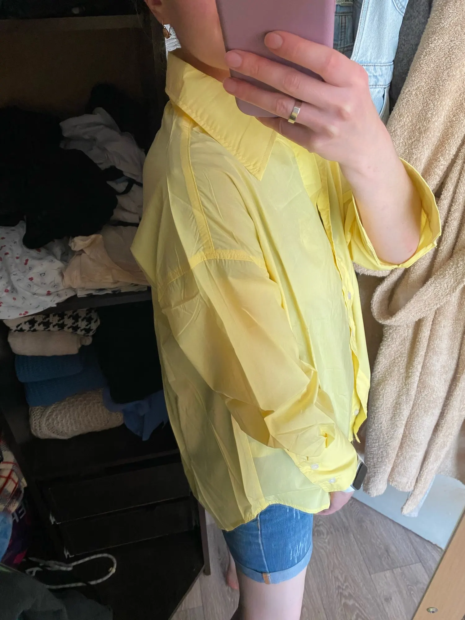 Рубашка хорошая, на рост 165 см рукава немного короткие, а в целом сидит как оверсайз, сзади рубашка длиннее. Я бы сказала, что материал хлопок, но на бирке указан полиэстер. Она не такая плотная как в z***, ткань тоньше, и даже просвечивает, для лета будет идеальна.