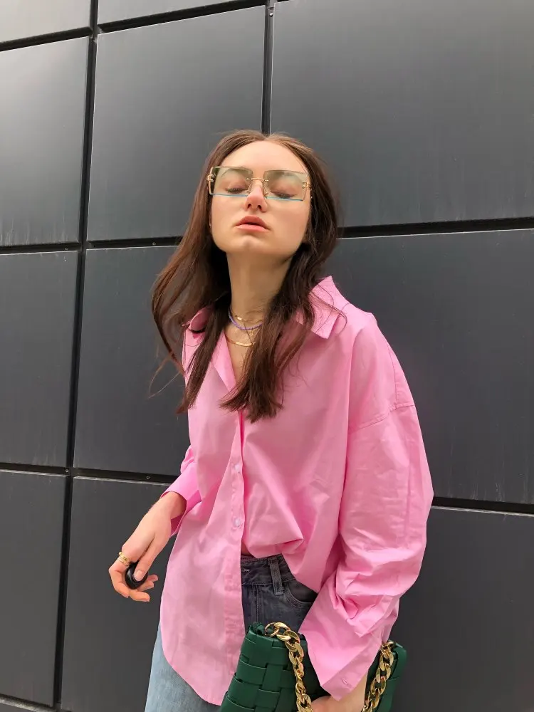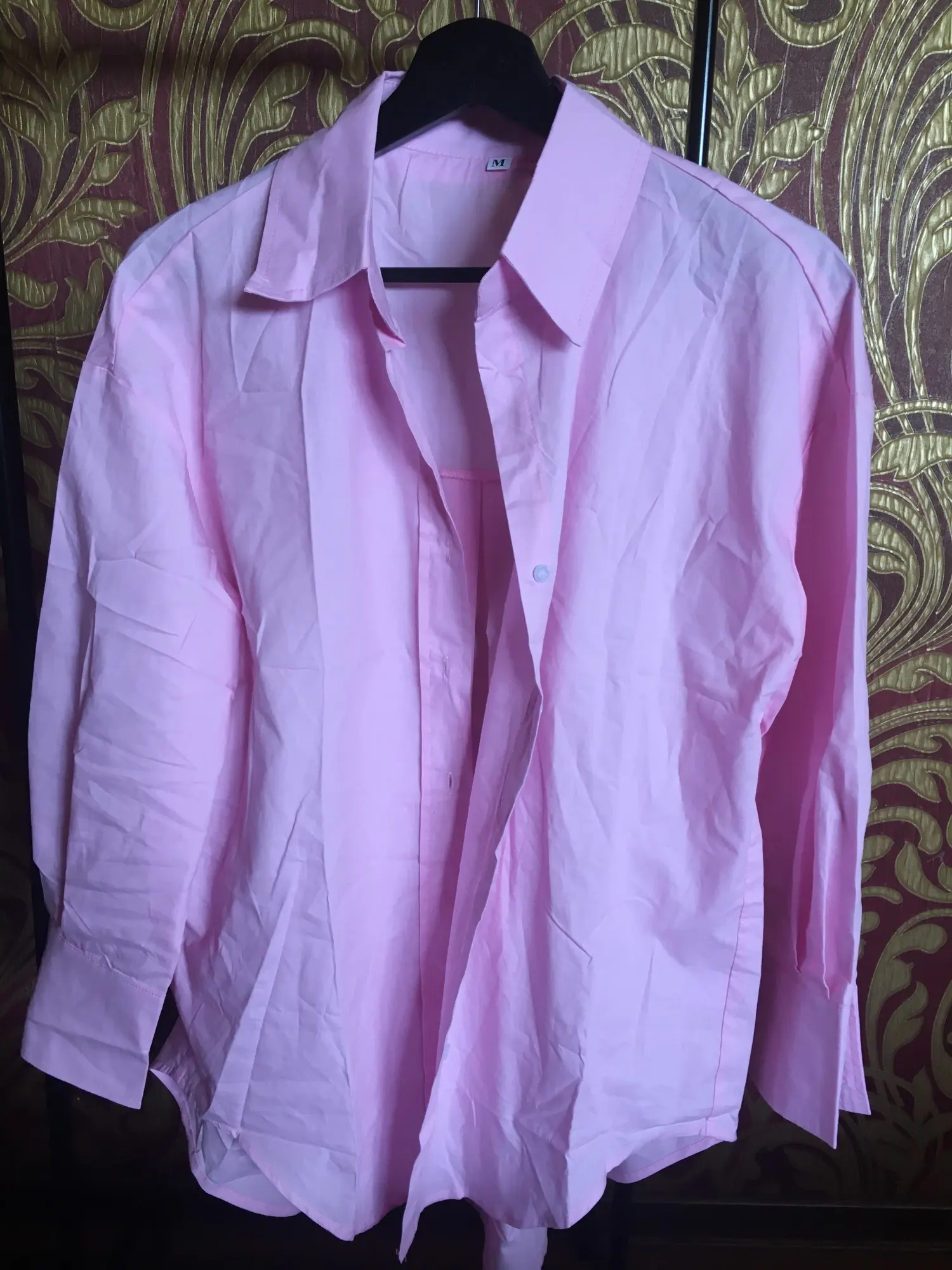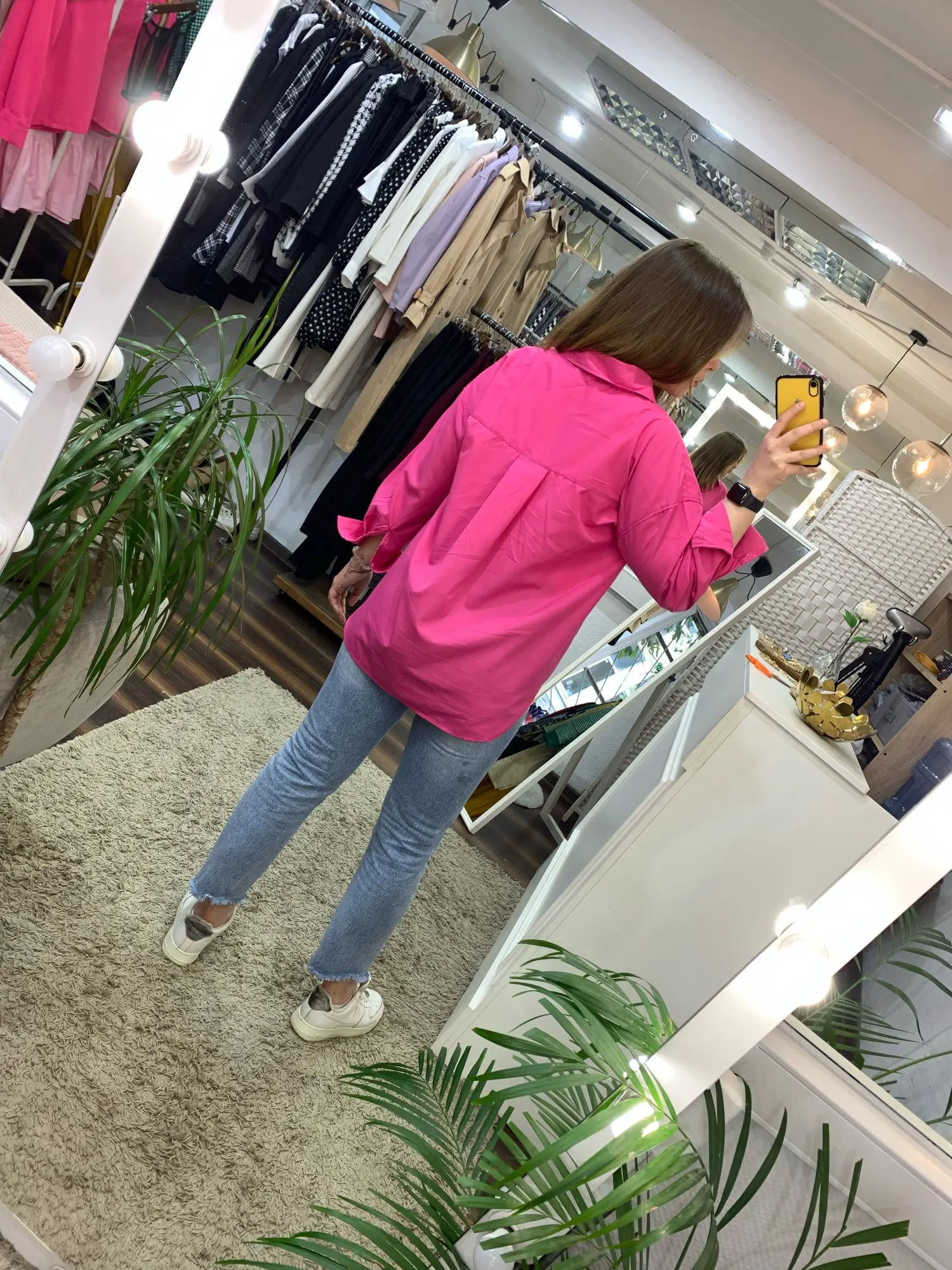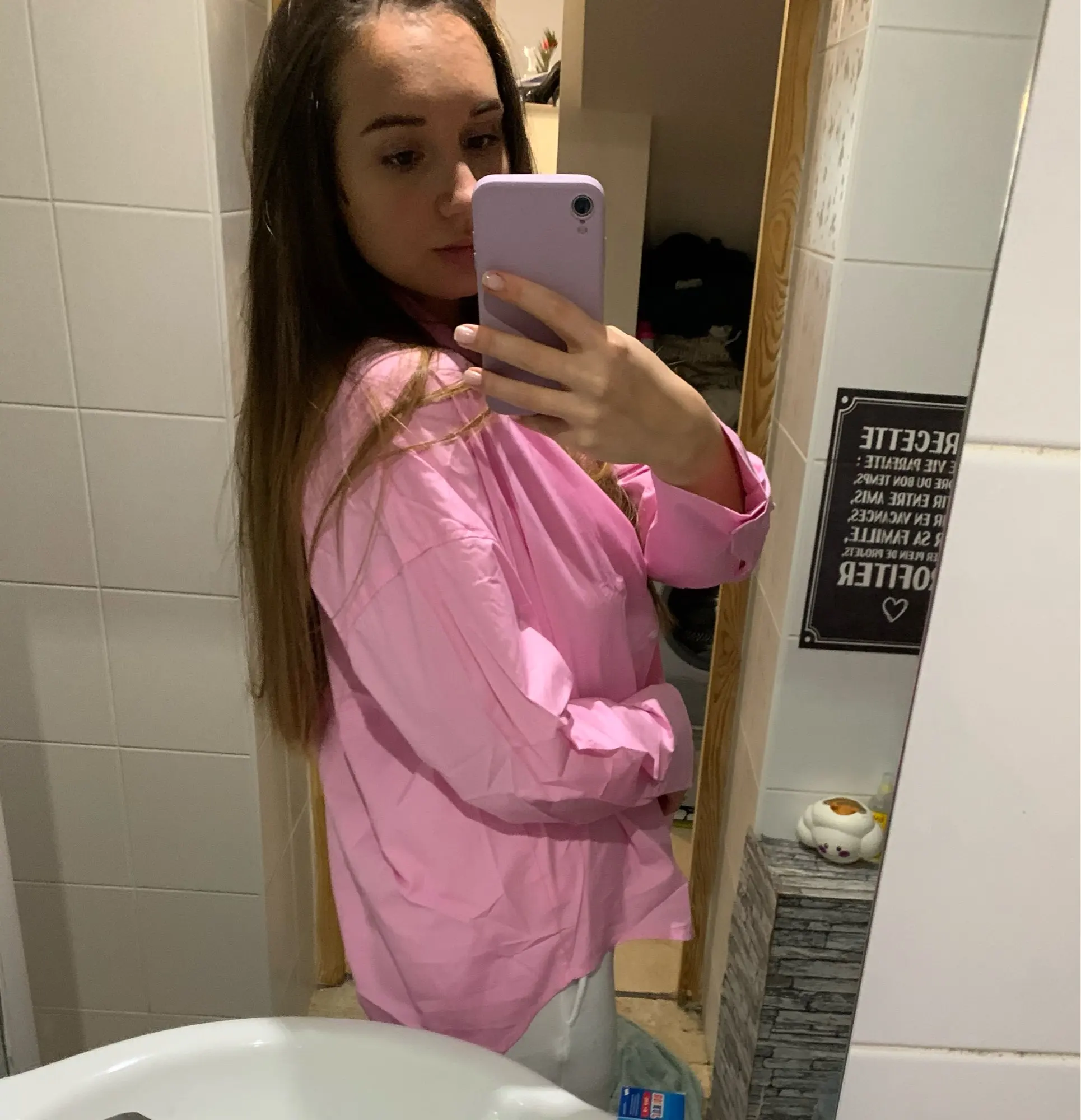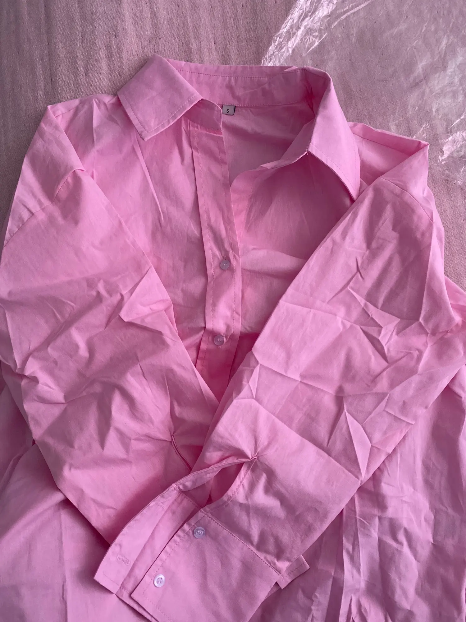Очень красивая рубашка! Оверсайз; смотрится потрясающе. Хороший насыщенный розовый цвет. Подходит как если заправлять ее в брюки, так и носить на выпуск. Очень советую! Покупала за 800-900 руб, доставили быстро.
