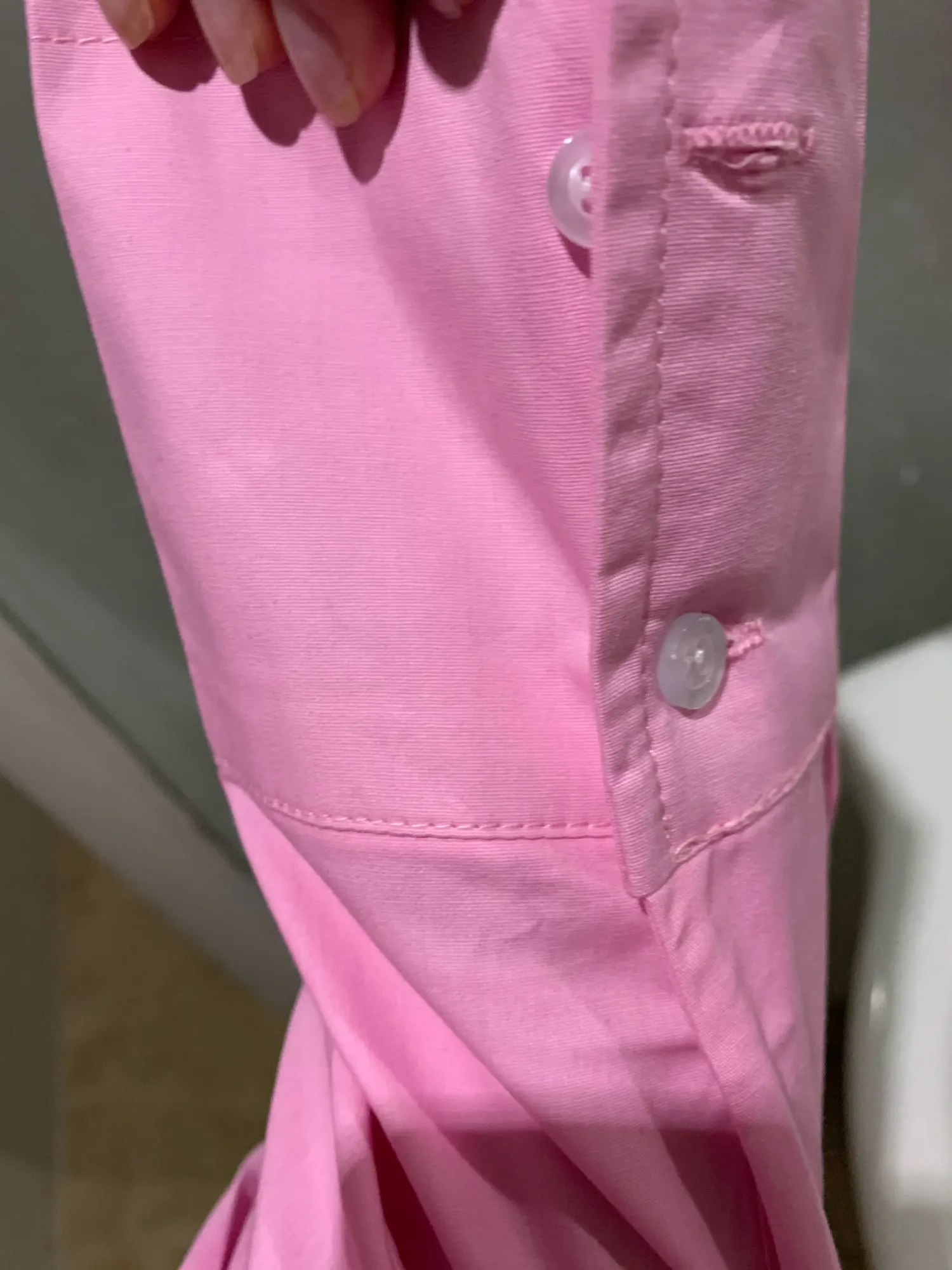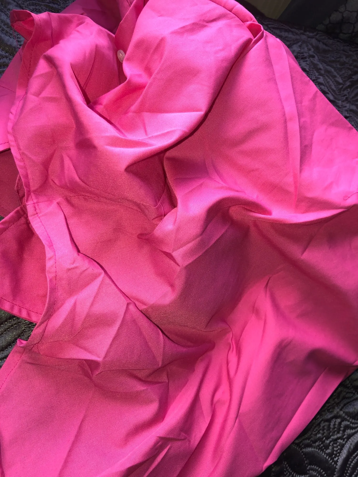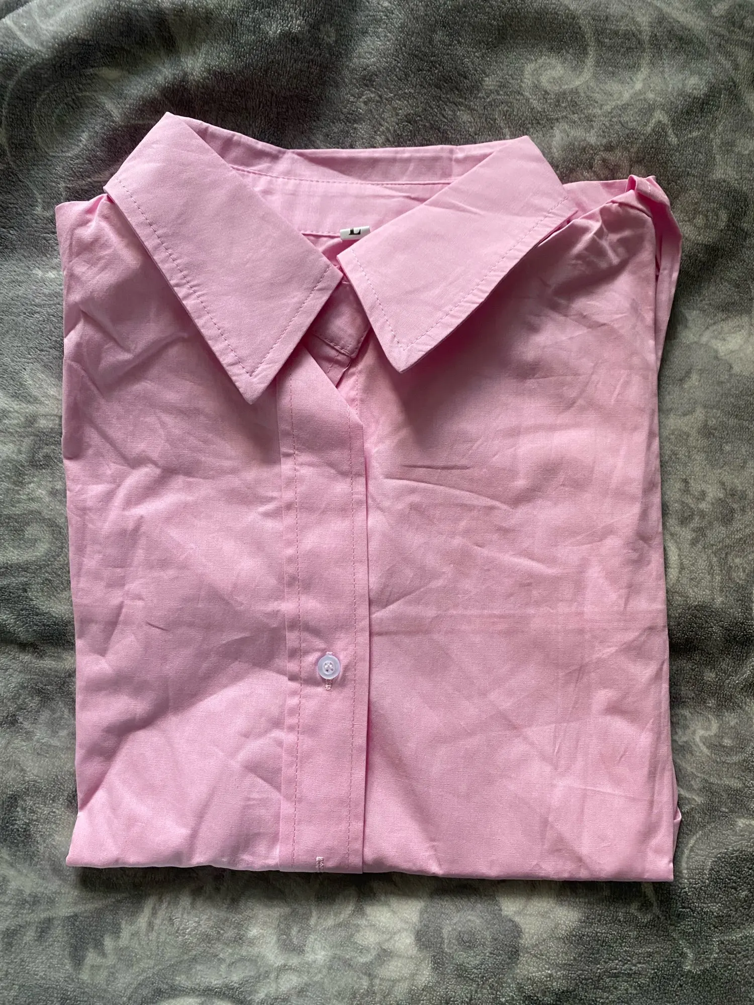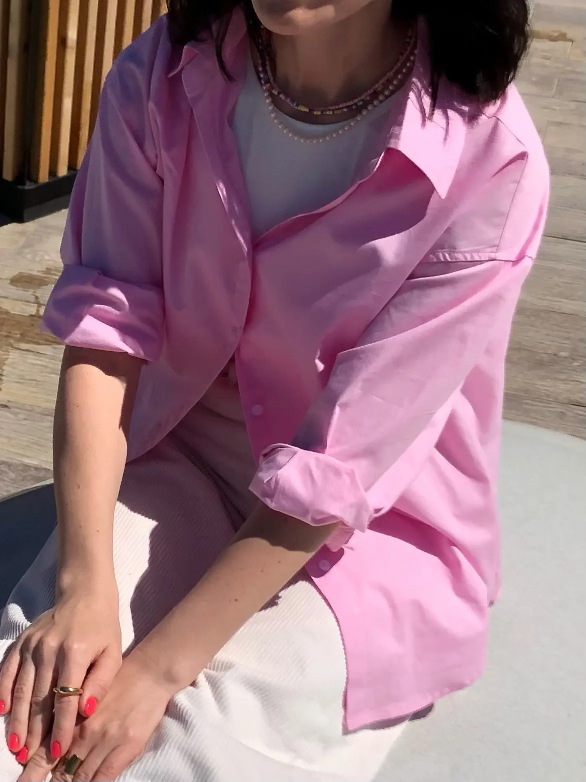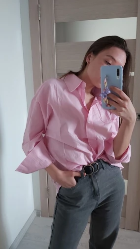 Очень красивая рубашка! Оверсайз; смотрится потрясающе. Хороший насыщенный розовый цвет. Подходит как если заправлять ее в брюки, так и носить на выпуск. Очень советую! Покупала за 800-900 руб, доставили быстро.