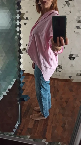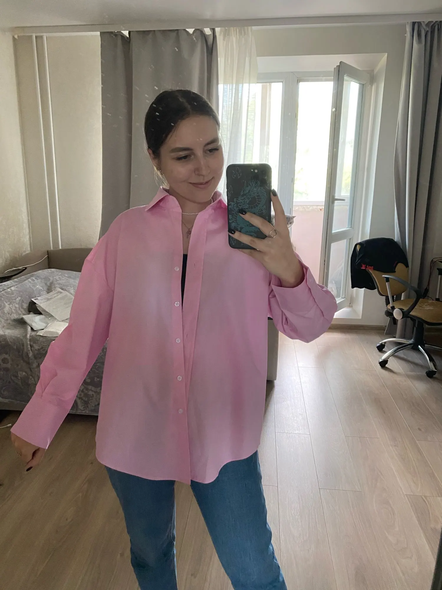 Не до конца решила, нравится мне или нет) на свой M заказала размер М, получился оверсайз конкретный. Вероятно, S сел бы даже лучше. Мне кажется, для такой широкой рубашки не хватает длины. Мой рост 168, рукава не короткие. Цвет не ярко розовый, больше выбеленный розовый. Спинка удлиненная. Качество хорошее.