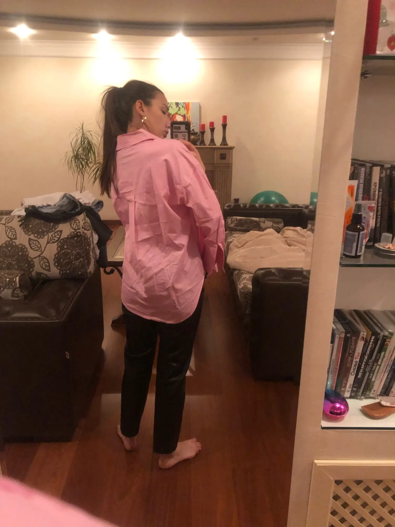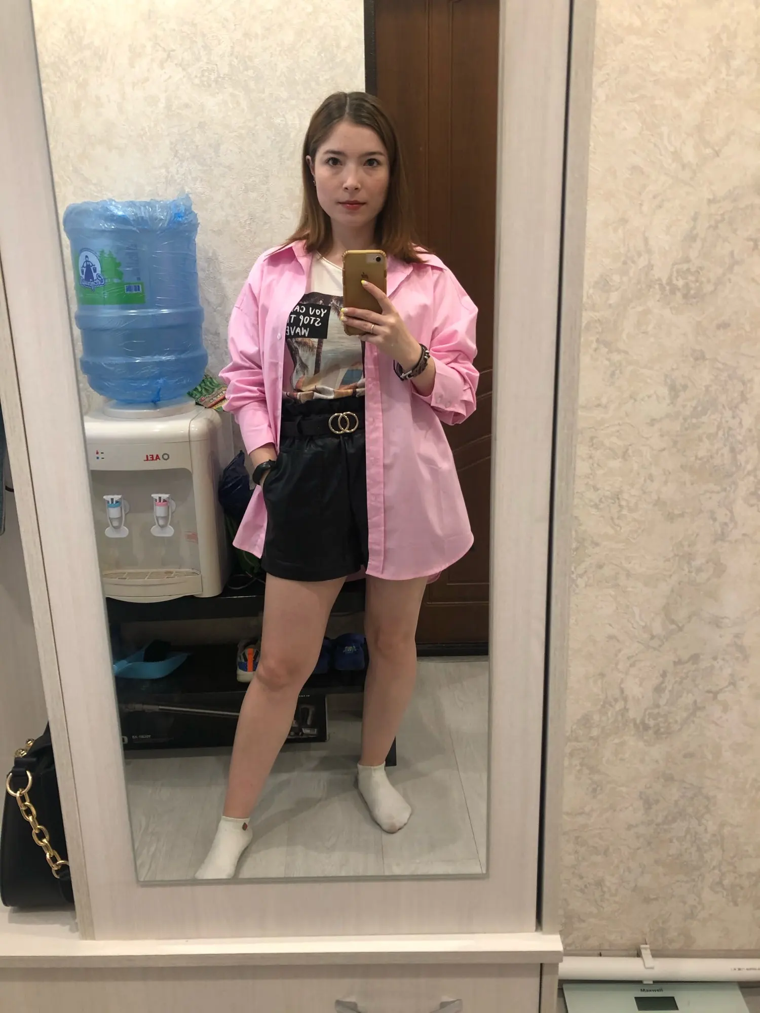 Рубашка оверсайз красивого розового цвета. Выполнена качественно. У меня в размере XS, на параметры 79/63 и рост 161 сидит свободно, есть запас в длине рукава. Состав на бирке указан как 100% полиэстер, но материал очень похож на натуральный, в нем совсем не жарко и он тяжело гладится, так что думаю что это хлопок, либо хлопок с полиэстером. Пришла быстро, за 10 дней доставкой 5post.