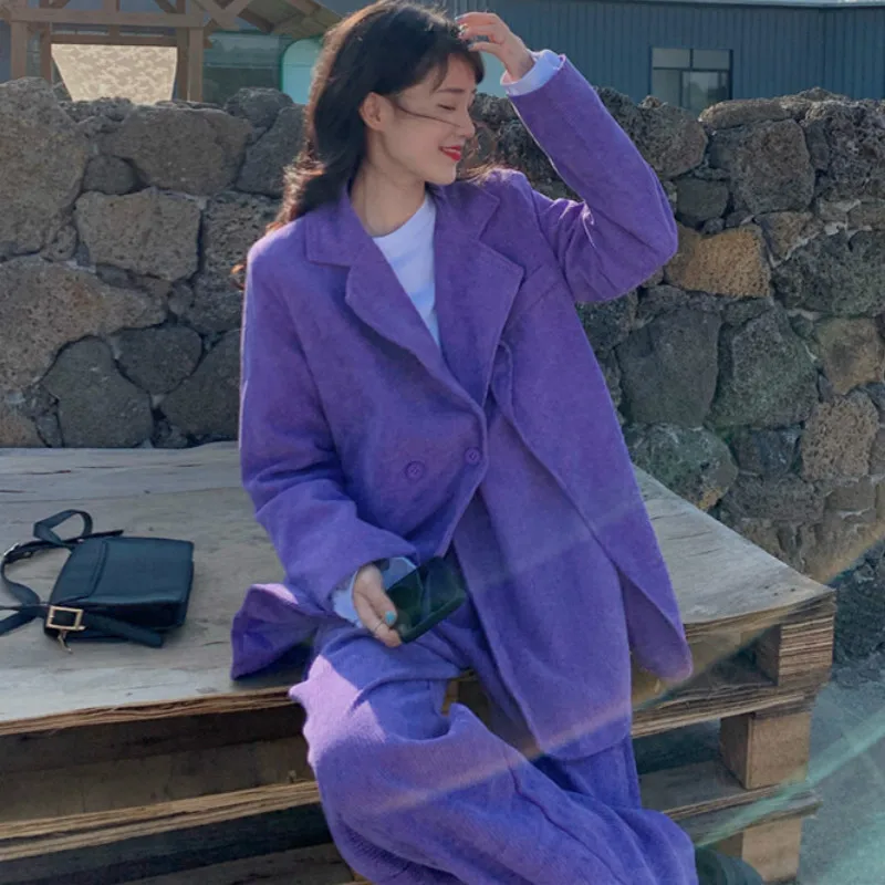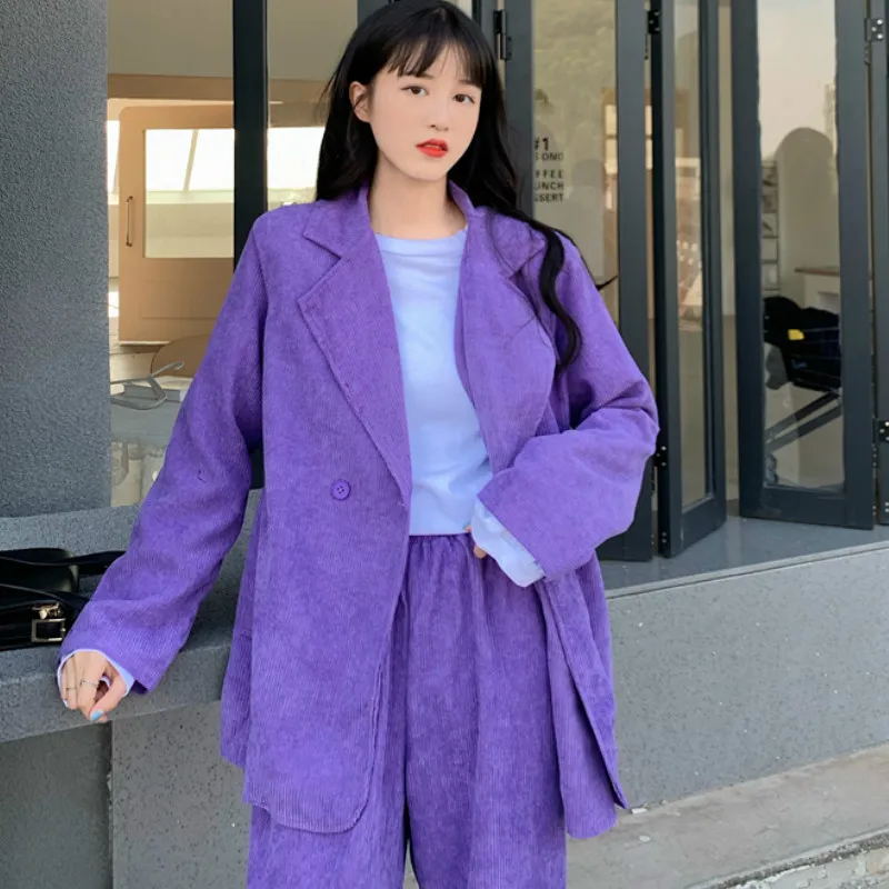 Женский вельветовый Блейзер, однотонный, фиолетовый, двубортный, в Корейском стиле, весна-осень, сплошные брюки