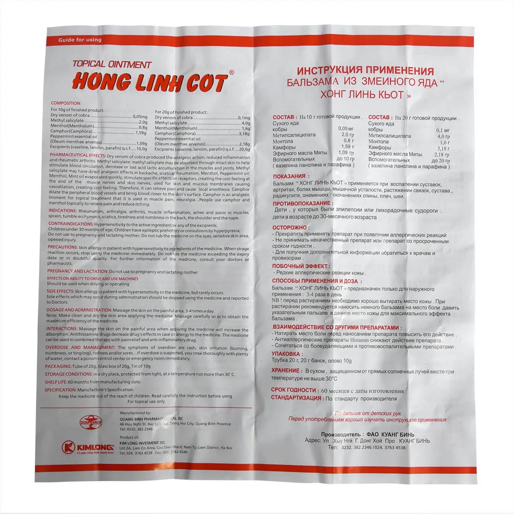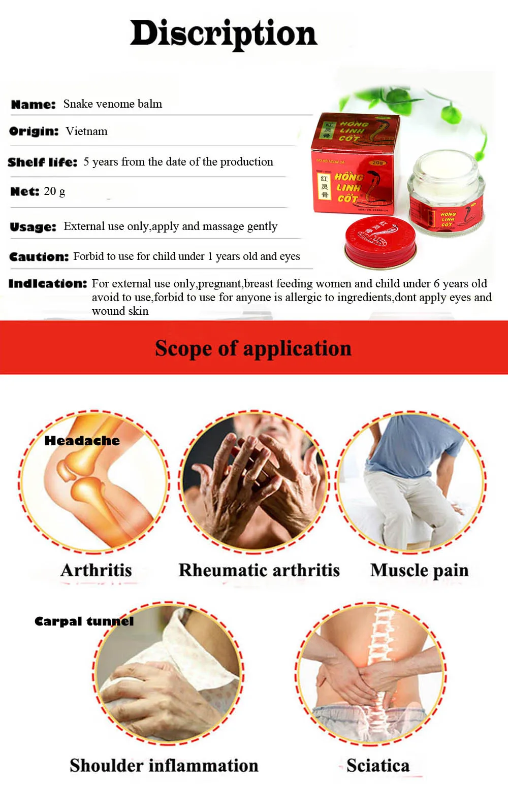 Сухой яд кобры вызывает анальгетическое действие, уменьшает воспаление и ревматический артрит. Метил салицилат: Метил салицилат может быть поглощен через неповрежденную кожу, чтобы помочь стимулировать кровообращение, уменьшить или потерять кислотное молочное накопление в мышцах и суставах. Метилсалицилат может иметь прямые анальгетические эффекты при болях в спине, радикуляции, ревматизме. Ментол, мятное Масло ментол, мятное Масло быстро испаряется, стимулирует специфическое воздействие на рецепторы, создавая ощущение прохлады в конце мышечных нервов и нервов кожи, используется для кожи и слизистых оболочек, вызывающих вазодилацию, создавая ощущение прохлады, поэтому он может облегчить боль и вызвать местную анестезию, Камфора расширяет периферические кровеносные сосуды и приближает кровь к поверхности кожи. Камфора является анальгетическим линитом для местного лечения, что он используется при мышечных болях, невралгии. Люди используют камфору и ментол, чтобы облегчить боль и уменьшить зуд