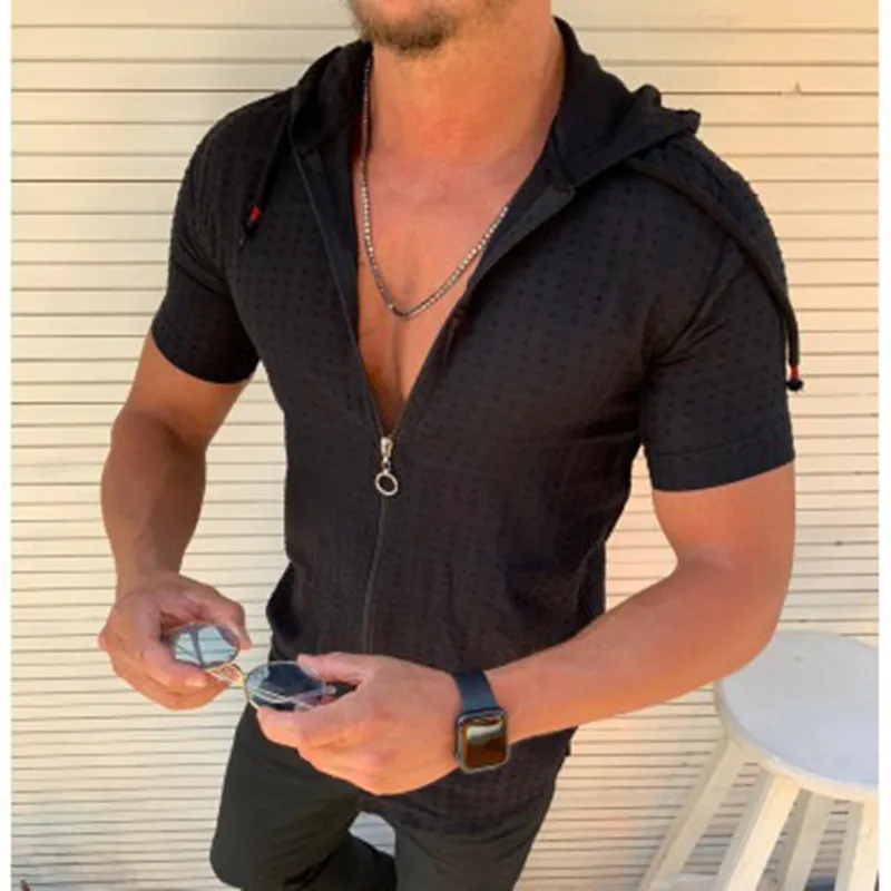 Мужская рубашка с капюшоном 2021, рубашка с короткими рукавами, мужской летний Повседневный клетчатый топ на молнии, однотонная белая блузка, Мужская тонкая одежда с открытым стежком