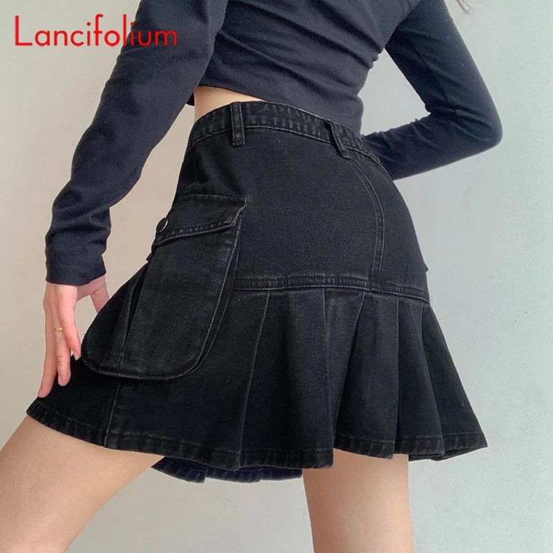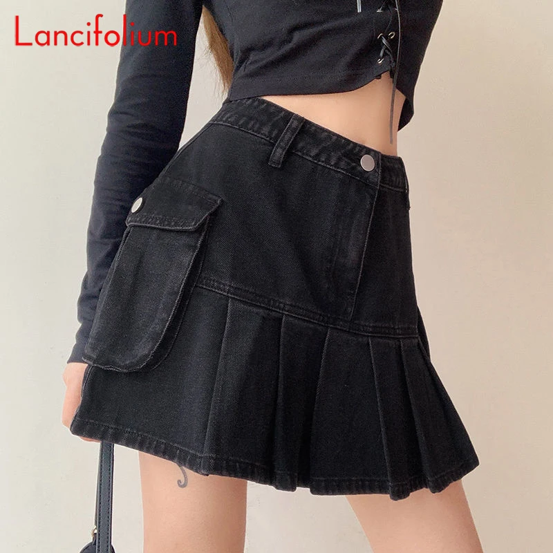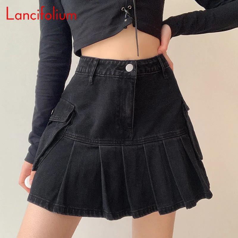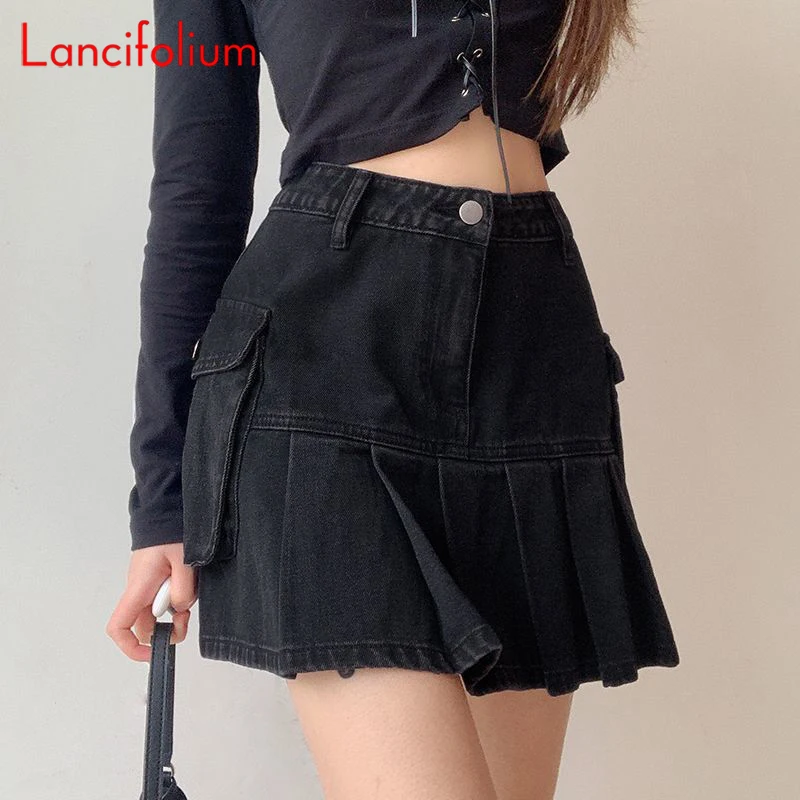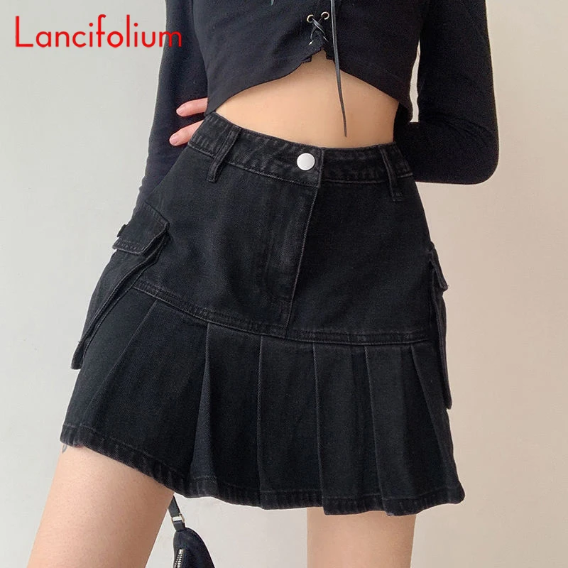 Женская плиссированная джинсовая юбка, черная мини-юбка с высокой талией, в готическом стиле, Y2k, в Корейском стиле, весна-лето, 2021